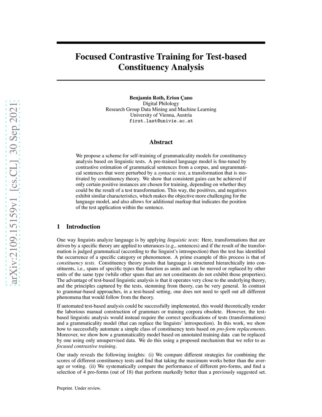 Focused Contrastive Training for Test-based Constituency Analysis