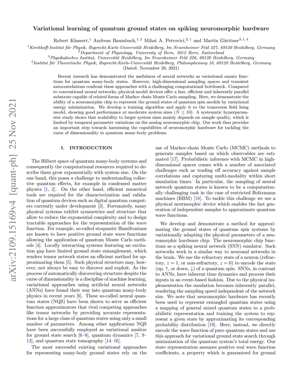 Recent research has demonstrated the usefulness of neural networks as variational ansatz functions for quantum many-body states. However, high-dimensional sampling spaces and transient autocorrelations confront these approaches with a challenging computational bottleneck. Compared to conventional neural networks, physical-model devices offer a fast, efficient and inherently parallel substrate capable of related forms of Markov chain Monte Carlo sampling. Here, we demonstrate the ability of a neuromorphic chip to represent the ground states of quantum spin models by variational energy minimization. We develop a training algorithm and apply it to the transverse field Ising model, showing good performance at moderate system sizes (). A systematic hyperparameter study shows that scalability to larger system sizes mainly depends on sample quality, which is limited by temporal parameter variations on the analog neuromorphic chip. Our work thus provides an important step towards harnessing the capabilities of neuromorphic hardware for tackling the curse of dimensionality in quantum many-body problems.