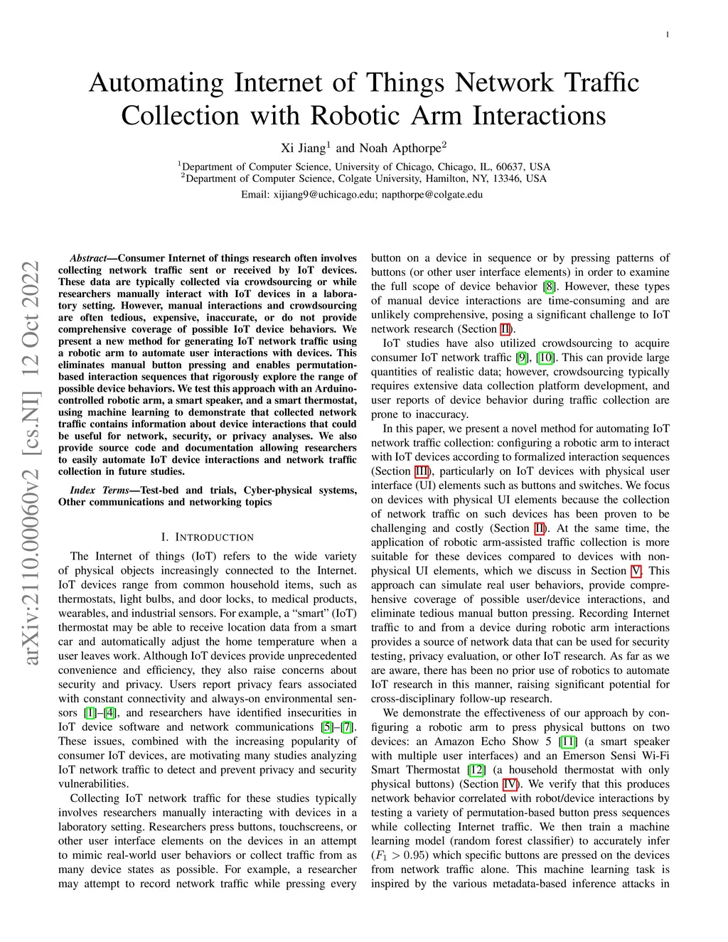 Consumer Internet of things research often involves collecting network traffic sent or received by IoT devices. These data are typically collected via crowdsourcing or while researchers manually interact with IoT devices in a laboratory setting. However, manual interactions and crowdsourcing are often tedious, expensive, inaccurate, or do not provide comprehensive coverage of possible IoT device behaviors. We present a new method for generating IoT network traffic using a robotic arm to automate user interactions with devices. This eliminates manual button pressing and enables permutation-based interaction sequences that rigorously explore the range of possible device behaviors. We test this approach with an Arduino-controlled robotic arm, a smart speaker and a smart thermostat, using machine learning to demonstrate that collected network traffic contains information about device interactions that could be useful for network, security, or privacy analyses. We also provide source code and documentation allowing researchers to easily automate IoT device interactions and network traffic collection in future studies.