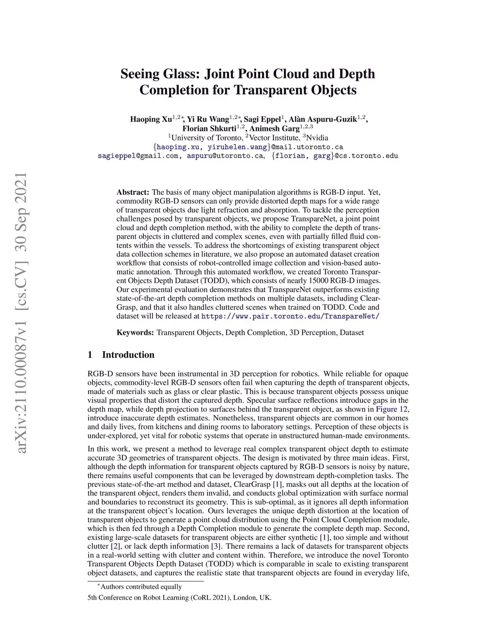 The basis of many object manipulation algorithms is RGB-D input. Yet, commodity RGB-D sensors can only provide distorted depth maps for a wide range of transparent objects due light refraction and absorption. To tackle the perception challenges posed by transparent objects, we propose TranspareNet, a joint point cloud and depth completion method, with the ability to complete the depth of transparent objects in cluttered and complex scenes, even with partially filled fluid contents within the vessels. To address the shortcomings of existing transparent object data collection schemes in literature, we also propose an automated dataset creation workflow that consists of robot-controlled image collection and vision-based automatic annotation. Through this automated workflow, we created Toronto Transparent Objects Depth Dataset (TODD), which consists of nearly 15000 RGB-D images. Our experimental evaluation demonstrates that TranspareNet outperforms existing state-of-the-art depth completion methods on multiple datasets, including ClearGrasp, and that it also handles cluttered scenes when trained on TODD. Code and dataset will be released at https://www.pair.toronto.edu/TranspareNet/