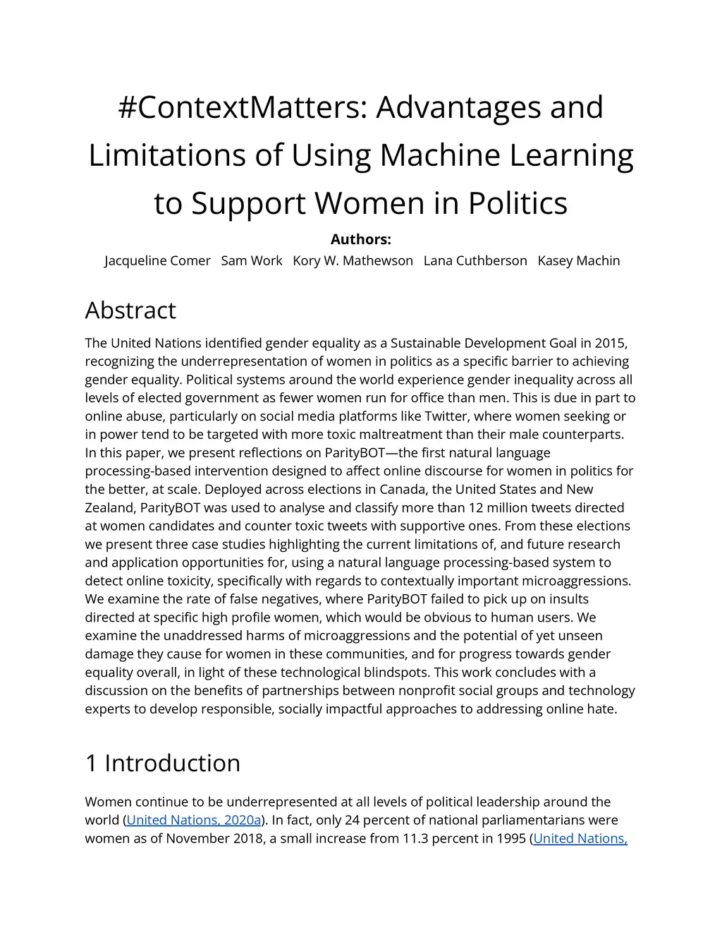 The United Nations identified gender equality as a Sustainable Development Goal in 2015, recognizing the underrepresentation of women in politics as a specific barrier to achieving gender equality. Political systems around the world experience gender inequality across all levels of elected government as fewer women run for office than men. This is due in part to online abuse, particularly on social media platforms like Twitter, where women seeking or in power tend to be targeted with more toxic maltreatment than their male counterparts. In this paper, we present reflections on ParityBOT - the first natural language processing-based intervention designed to affect online discourse for women in politics for the better, at scale. Deployed across elections in Canada, the United States and New Zealand, ParityBOT was used to analyse and classify more than 12 million tweets directed at women candidates and counter toxic tweets with supportive ones. From these elections we present three case studies highlighting the current limitations of, and future research and application opportunities for, using a natural language processing-based system to detect online toxicity, specifically with regards to contextually important microaggressions. We examine the rate of false negatives, where ParityBOT failed to pick up on insults directed at specific high profile women, which would be obvious to human users. We examine the unaddressed harms of microaggressions and the potential of yet unseen damage they cause for women in these communities, and for progress towards gender equality overall, in light of these technological blindspots. This work concludes with a discussion on the benefits of partnerships between nonprofit social groups and technology experts to develop responsible, socially impactful approaches to addressing online hate.