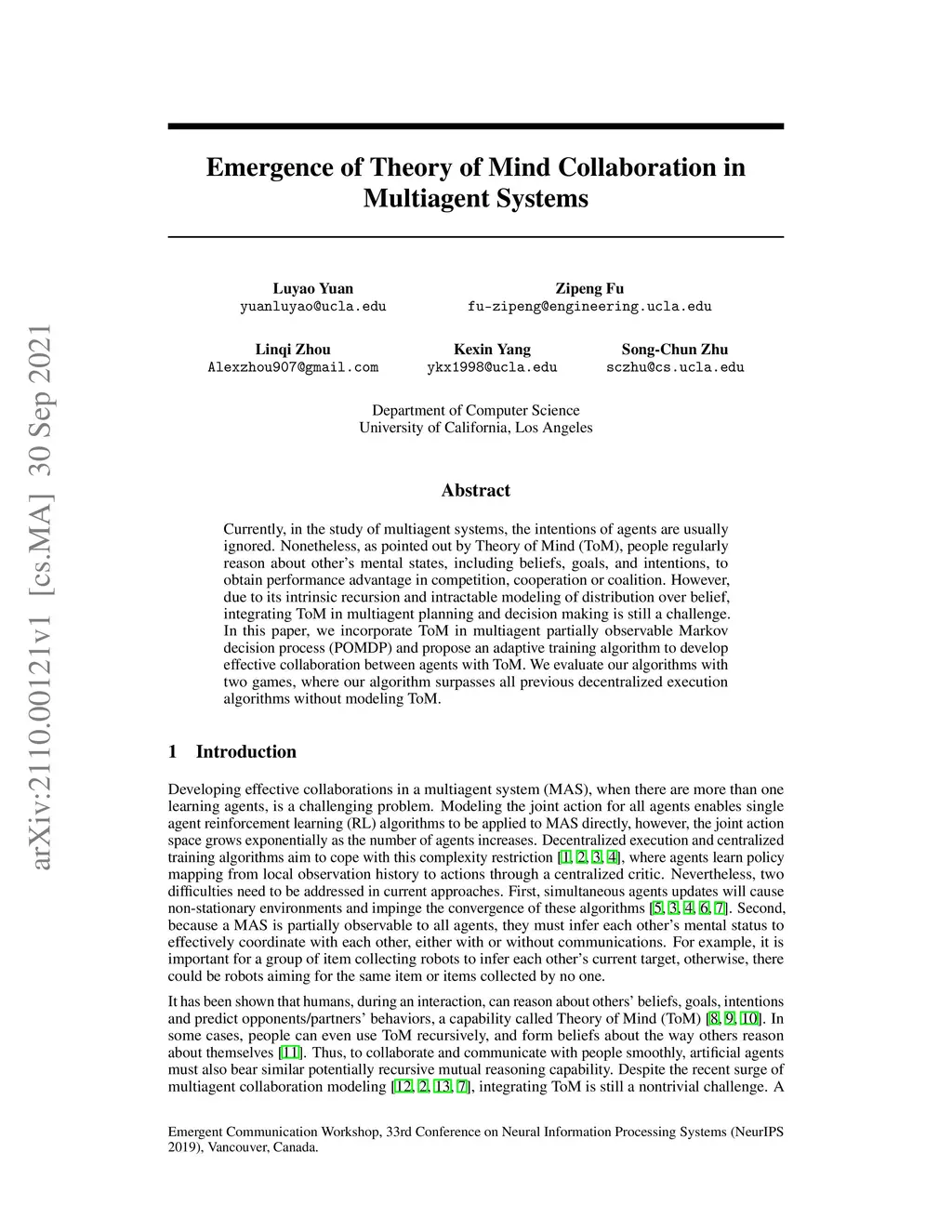 Emergence of Theory of Mind Collaboration in Multiagent Systems