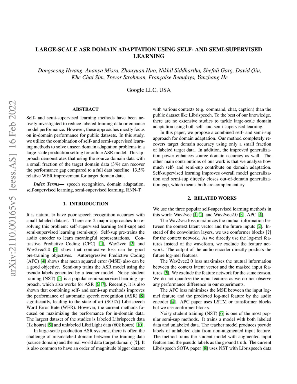 Self- and semi-supervised learning methods have been actively investigated to reduce labeled training data or enhance the model performance. However, the approach mostly focus on in-domain performance for public datasets. In this study, we utilize the combination of self- and semi-supervised learning methods to solve unseen domain adaptation problem in a large-scale production setting for online ASR model. This approach demonstrates that using the source domain data with a small fraction of the target domain data (3%) can recover the performance gap compared to a full data baseline: relative 13.5% WER improvement for target domain data.