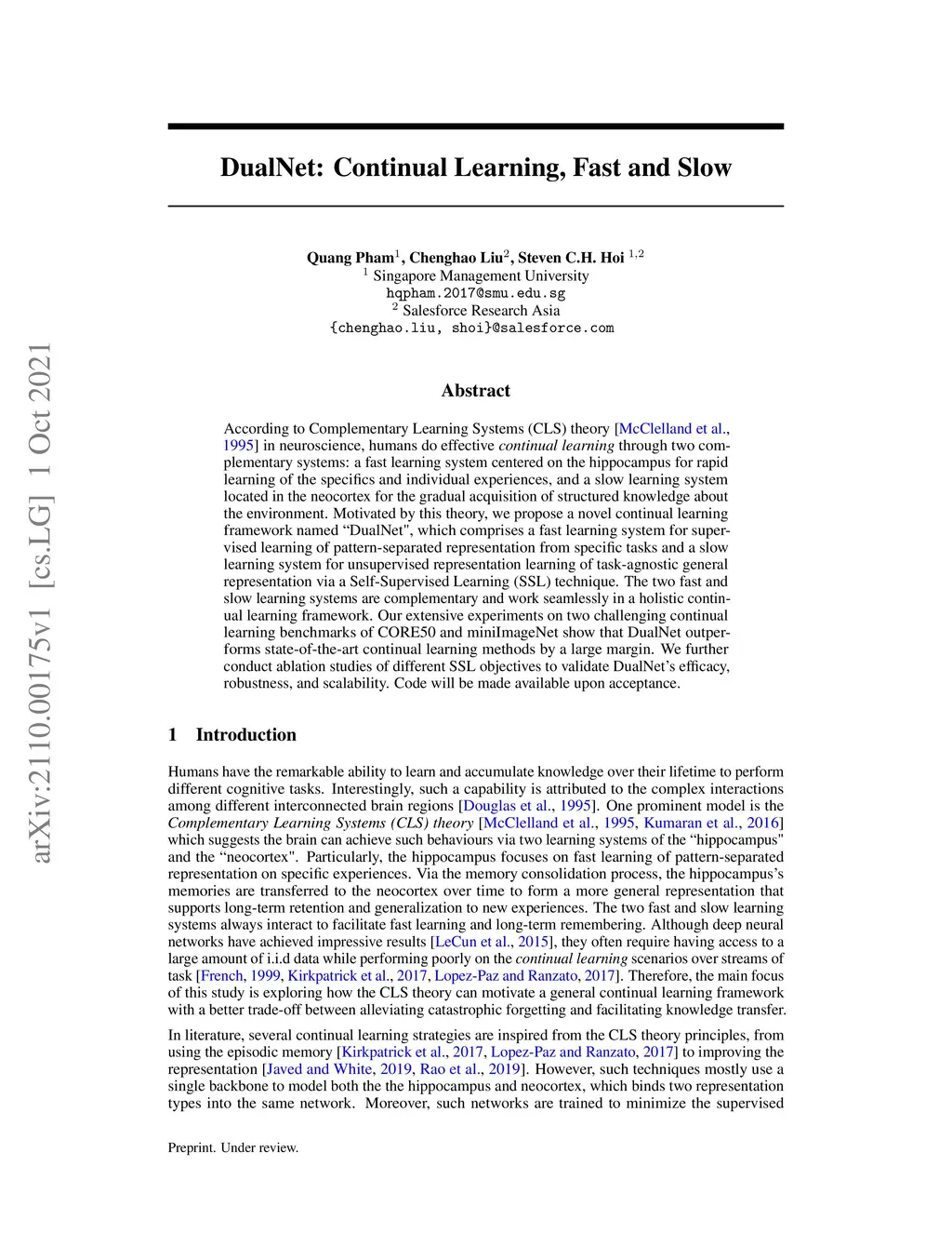 According to Complementary Learning Systems (CLS) theory~\citep{mcclelland1995there} in neuroscience, humans do effective \emph{continual learning} through two complementary systems: a fast learning system centered on the hippocampus for rapid learning of the specifics and individual experiences, and a slow learning system located in the neocortex for the gradual acquisition of structured knowledge about the environment. Motivated by this theory, we propose a novel continual learning framework named "DualNet", which comprises a fast learning system for supervised learning of pattern-separated representation from specific tasks and a slow learning system for unsupervised representation learning of task-agnostic general representation via a Self-Supervised Learning (SSL) technique. The two fast and slow learning systems are complementary and work seamlessly in a holistic continual learning framework. Our extensive experiments on two challenging continual learning benchmarks of CORE50 and miniImageNet show that DualNet outperforms state-of-the-art continual learning methods by a large margin. We further conduct ablation studies of different SSL objectives to validate DualNet's efficacy, robustness, and scalability. Code will be made available upon acceptance.