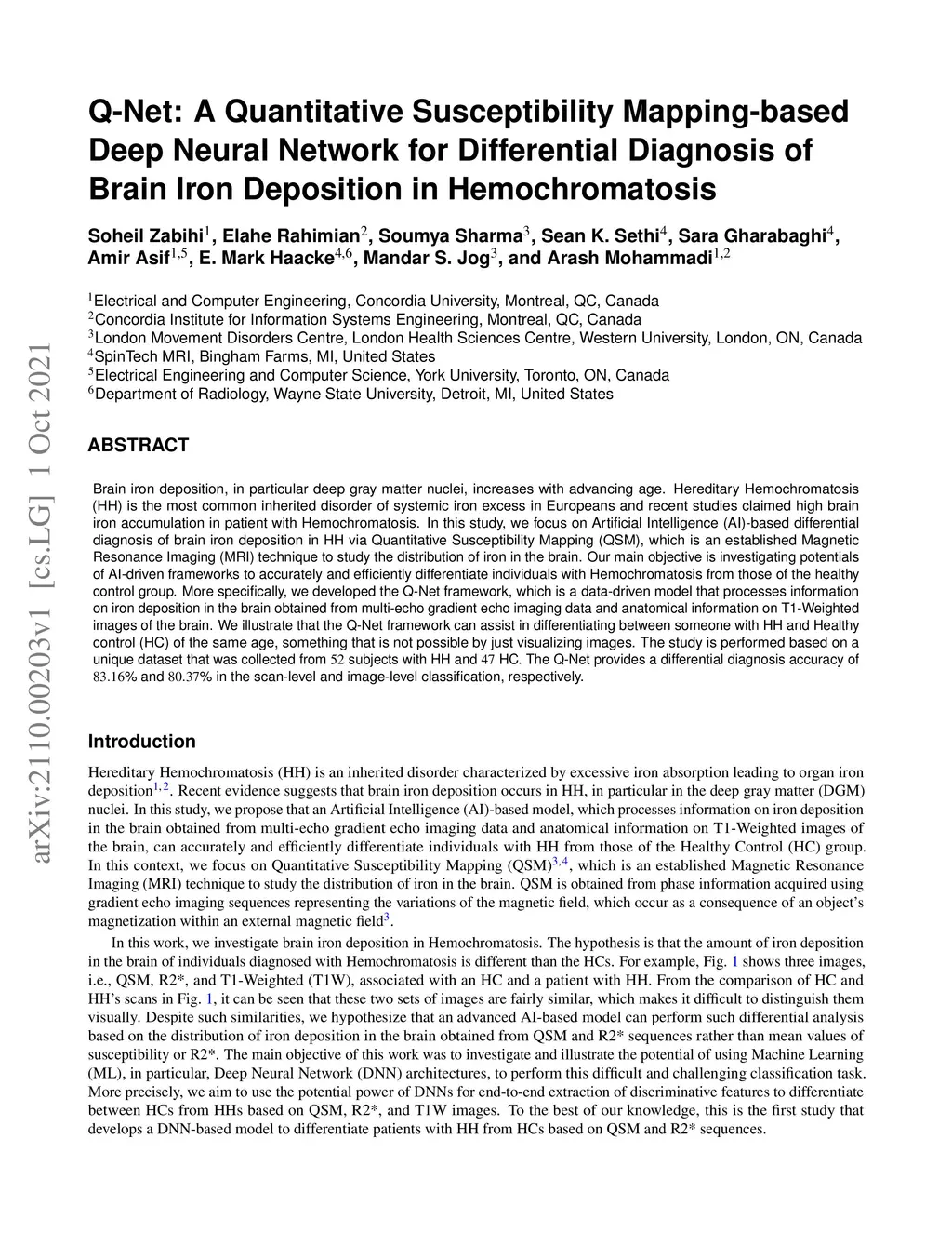Brain iron deposition, in particular deep gray matter nuclei, increases with advancing age. Hereditary Hemochromatosis (HH) is the most common inherited disorder of systemic iron excess in Europeans and recent studies claimed high brain iron accumulation in patient with Hemochromatosis. In this study, we focus on Artificial Intelligence (AI)-based differential diagnosis of brain iron deposition in HH via Quantitative Susceptibility Mapping (QSM), which is an established Magnetic Resonance Imaging (MRI) technique to study the distribution of iron in the brain. Our main objective is investigating potentials of AI-driven frameworks to accurately and efficiently differentiate individuals with Hemochromatosis from those of the healthy control group. More specifically, we developed the Q-Net framework, which is a data-driven model that processes information on iron deposition in the brain obtained from multi-echo gradient echo imaging data and anatomical information on T1-Weighted images of the brain. We illustrate that the Q-Net framework can assist in differentiating between someone with HH and Healthy control (HC) of the same age, something that is not possible by just visualizing images. The study is performed based on a unique dataset that was collected from 52 subjects with HH and 47 HC. The Q-Net provides a differential diagnosis accuracy of 83.16% and 80.37% in the scan-level and image-level classification, respectively.