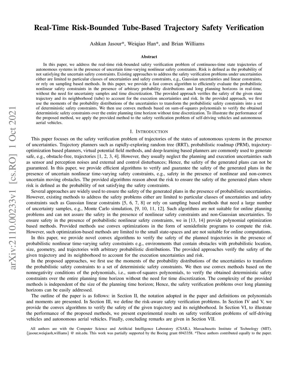 In this paper, we address the real-time risk-bounded safety verification problem of continuous-time state trajectories of autonomous systems in the presence of uncertain time-varying nonlinear safety constraints. Risk is defined as the probability of not satisfying the uncertain safety constraints. Existing approaches to address the safety verification problems under uncertainties either are limited to particular classes of uncertainties and safety constraints, e.g., Gaussian uncertainties and linear constraints, or rely on sampling based methods. In this paper, we provide a fast convex algorithm to efficiently evaluate the probabilistic nonlinear safety constraints in the presence of arbitrary probability distributions and long planning horizons in real-time, without the need for uncertainty samples and time discretization. The provided approach verifies the safety of the given state trajectory and its neighborhood (tube) to account for the execution uncertainties and risk. In the provided approach, we first use the moments of the probability distributions of the uncertainties to transform the probabilistic safety constraints into a set of deterministic safety constraints. We then use convex methods based on sum-of-squares polynomials to verify the obtained deterministic safety constraints over the entire planning time horizon without time discretization. To illustrate the performance of the proposed method, we apply the provided method to the safety verification problem of self-driving vehicles and autonomous aerial vehicles.