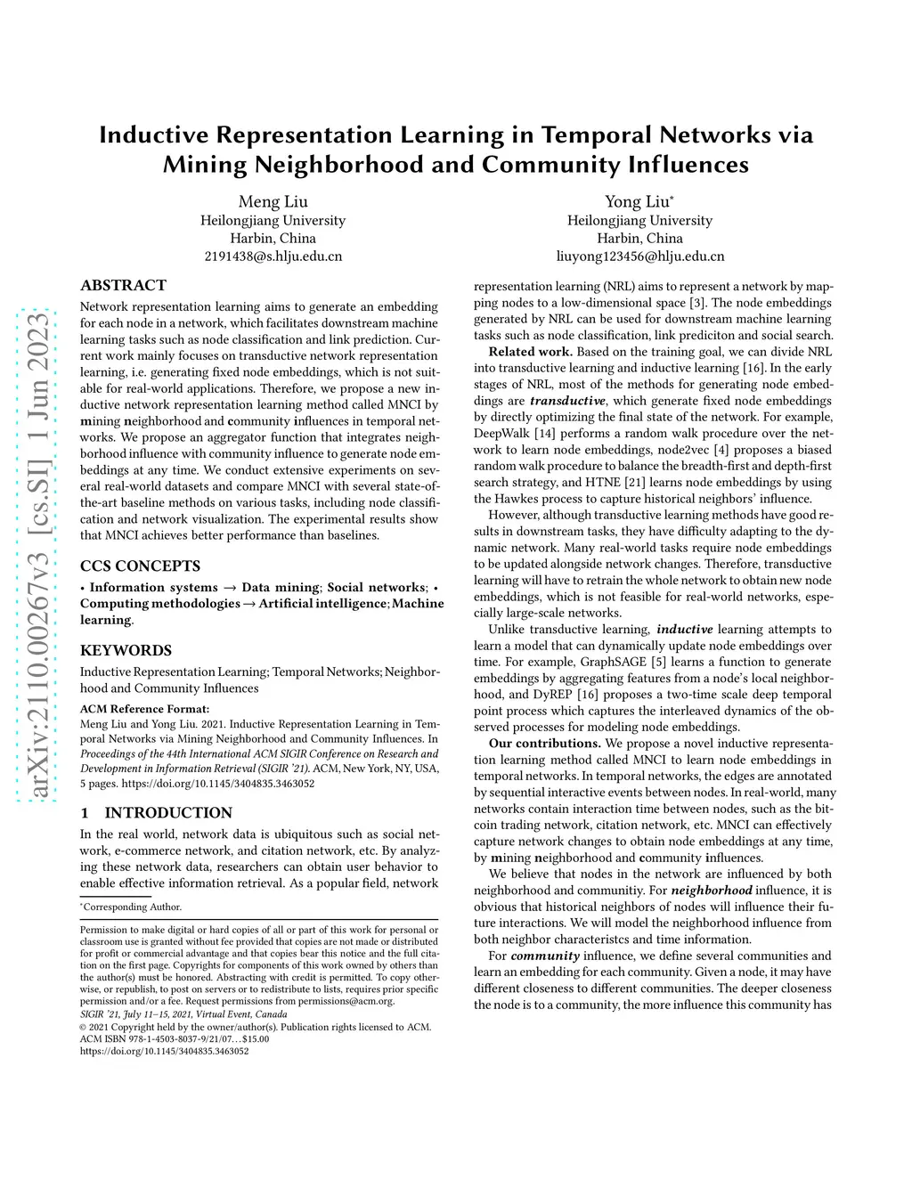 Network representation learning aims to generate an embedding for each node in a network, which facilitates downstream machine learning tasks such as node classification and link prediction. Current work mainly focuses on transductive network representation learning, i.e. generating fixed node embeddings, which is not suitable for real-world applications. Therefore, we propose a new inductive network representation learning method called MNCI by mining neighborhood and community influences in temporal networks. We propose an aggregator function that integrates neighborhood influence with community influence to generate node embeddings at any time. We conduct extensive experiments on several real-world datasets and compare MNCI with several state-of-the-art baseline methods on various tasks, including node classification and network visualization. The experimental results show that MNCI achieves better performance than baselines.
