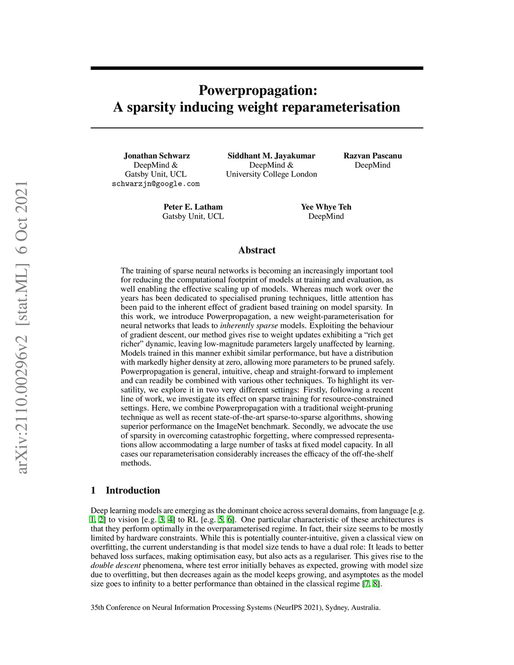 The training of sparse neural networks is becoming an increasingly important tool for reducing the computational footprint of models at training and evaluation, as well enabling the effective scaling up of models. Whereas much work over the years has been dedicated to specialised pruning techniques, little attention has been paid to the inherent effect of gradient based training on model sparsity. In this work, we introduce Powerpropagation, a new weight-parameterisation for neural networks that leads to inherently sparse models. Exploiting the behaviour of gradient descent, our method gives rise to weight updates exhibiting a "rich get richer" dynamic, leaving low-magnitude parameters largely unaffected by learning. Models trained in this manner exhibit similar performance, but have a distribution with markedly higher density at zero, allowing more parameters to be pruned safely. Powerpropagation is general, intuitive, cheap and straight-forward to implement and can readily be combined with various other techniques. To highlight its versatility, we explore it in two very different settings: Firstly, following a recent line of work, we investigate its effect on sparse training for resource-constrained settings. Here, we combine Powerpropagation with a traditional weight-pruning technique as well as recent state-of-the-art sparse-to-sparse algorithms, showing superior performance on the ImageNet benchmark. Secondly, we advocate the use of sparsity in overcoming catastrophic forgetting, where compressed representations allow accommodating a large number of tasks at fixed model capacity. In all cases our reparameterisation considerably increases the efficacy of the off-the-shelf methods.