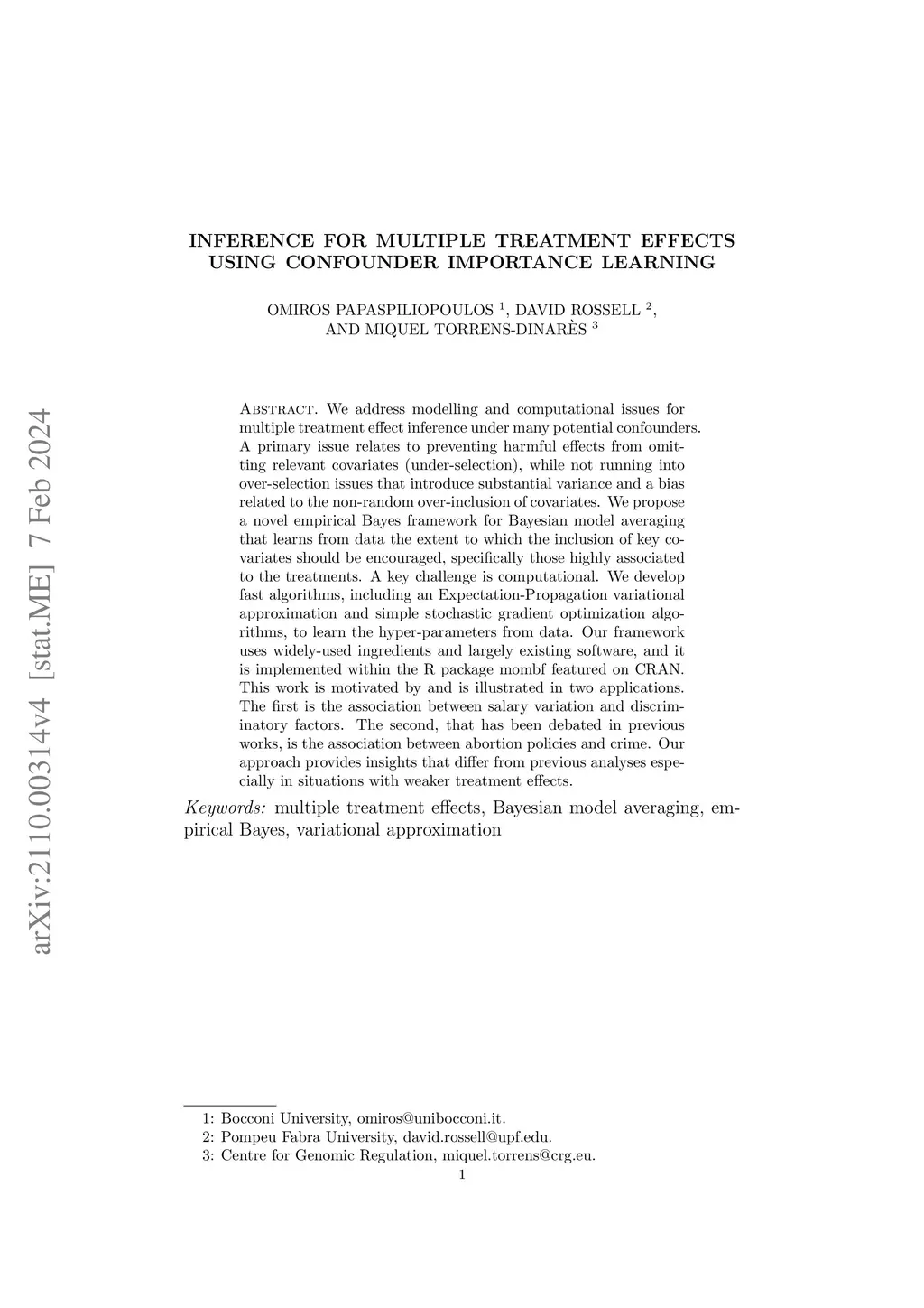 We address modelling and computational issues for multiple treatment effect inference under many potential confounders. A primary issue relates to preventing harmful effects from omitting relevant covariates (under-selection), while not running into over-selection issues that introduce substantial variance and a bias related to the non-random over-inclusion of covariates. We propose a novel empirical Bayes framework for Bayesian model averaging that learns from data the extent to which the inclusion of key covariates should be encouraged, specifically those highly associated to the treatments. A key challenge is computational. We develop fast algorithms, including an Expectation-Propagation variational approximation and simple stochastic gradient optimization algorithms, to learn the hyper-parameters from data. Our framework uses widely-used ingredients and largely existing software, and it is implemented within the R package mombf featured on CRAN. This work is motivated by and is illustrated in two applications. The first is the association between salary variation and discriminatory factors. The second, that has been debated in previous works, is the association between abortion policies and crime. Our approach provides insights that differ from previous analyses especially in situations with weaker treatment effects.