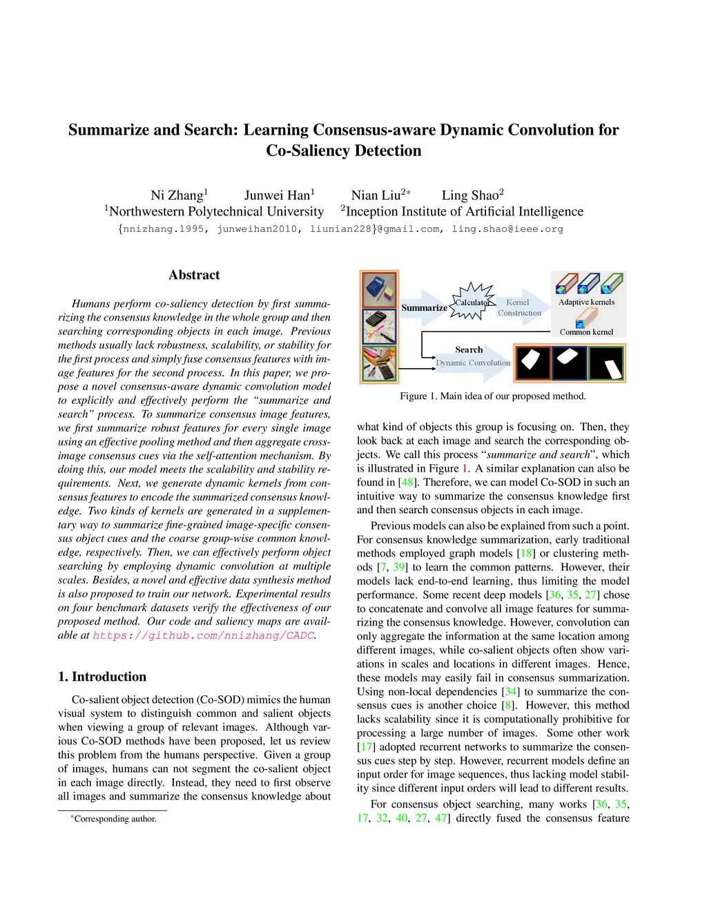 Humans perform co-saliency detection by first summarizing the consensus knowledge in the whole group and then searching corresponding objects in each image. Previous methods usually lack robustness, scalability, or stability for the first process and simply fuse consensus features with image features for the second process. In this paper, we propose a novel consensus-aware dynamic convolution model to explicitly and effectively perform the "summarize and search" process. To summarize consensus image features, we first summarize robust features for every single image using an effective pooling method and then aggregate cross-image consensus cues via the self-attention mechanism. By doing this, our model meets the scalability and stability requirements. Next, we generate dynamic kernels from consensus features to encode the summarized consensus knowledge. Two kinds of kernels are generated in a supplementary way to summarize fine-grained image-specific consensus object cues and the coarse group-wise common knowledge, respectively. Then, we can effectively perform object searching by employing dynamic convolution at multiple scales. Besides, a novel and effective data synthesis method is also proposed to train our network. Experimental results on four benchmark datasets verify the effectiveness of our proposed method. Our code and saliency maps are available at \url{https://github.com/nnizhang/CADC}.