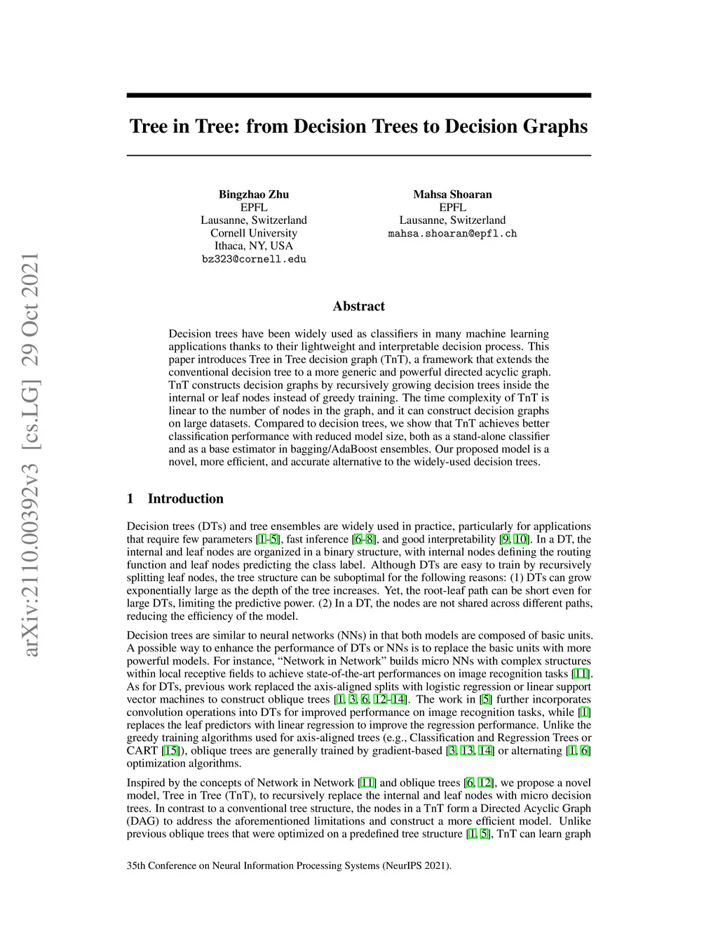 Decision trees have been widely used as classifiers in many machine learning applications thanks to their lightweight and interpretable decision process. This paper introduces Tree in Tree decision graph (TnT), a framework that extends the conventional decision tree to a more generic and powerful directed acyclic graph. TnT constructs decision graphs by recursively growing decision trees inside the internal or leaf nodes instead of greedy training. The time complexity of TnT is linear to the number of nodes in the graph, and it can construct decision graphs on large datasets. Compared to decision trees, we show that TnT achieves better classification performance with reduced model size, both as a stand-alone classifier and as a base estimator in bagging/AdaBoost ensembles. Our proposed model is a novel, more efficient, and accurate alternative to the widely-used decision trees.