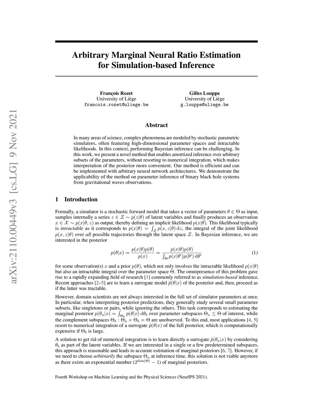 In many areas of science, complex phenomena are modeled by stochastic parametric simulators, often featuring high-dimensional parameter spaces and intractable likelihoods. In this context, performing Bayesian inference can be challenging. In this work, we present a novel method that enables amortized inference over arbitrary subsets of the parameters, without resorting to numerical integration, which makes interpretation of the posterior more convenient. Our method is efficient and can be implemented with arbitrary neural network architectures. We demonstrate the applicability of the method on parameter inference of binary black hole systems from gravitational waves observations.