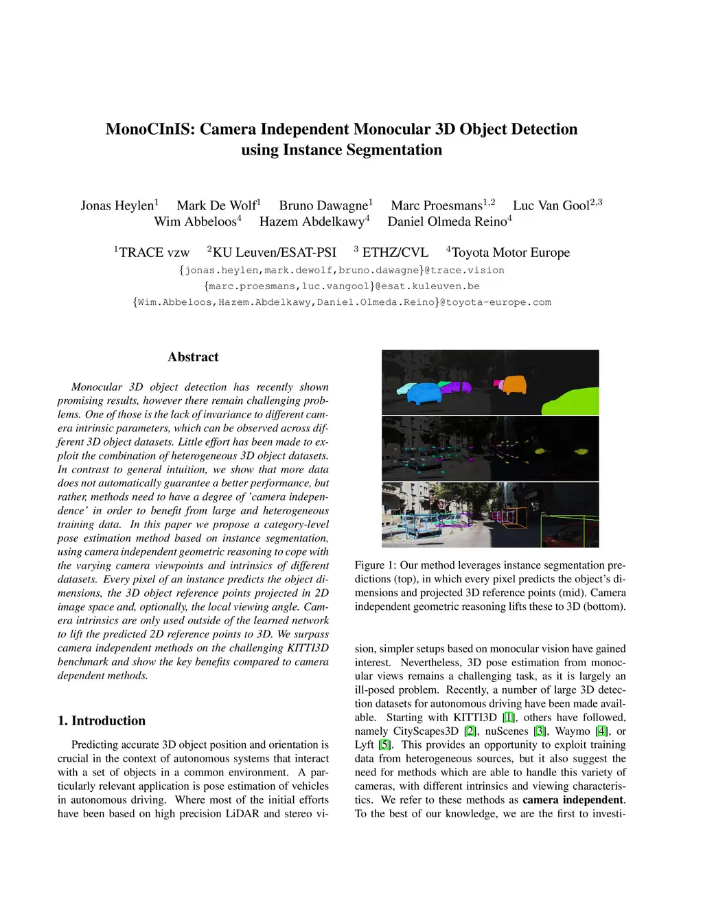 Monocular 3D object detection has recently shown promising results, however there remain challenging problems. One of those is the lack of invariance to different camera intrinsic parameters, which can be observed across different 3D object datasets. Little effort has been made to exploit the combination of heterogeneous 3D object datasets. In contrast to general intuition, we show that more data does not automatically guarantee a better performance, but rather, methods need to have a degree of 'camera independence' in order to benefit from large and heterogeneous training data. In this paper we propose a category-level pose estimation method based on instance segmentation, using camera independent geometric reasoning to cope with the varying camera viewpoints and intrinsics of different datasets. Every pixel of an instance predicts the object dimensions, the 3D object reference points projected in 2D image space and, optionally, the local viewing angle. Camera intrinsics are only used outside of the learned network to lift the predicted 2D reference points to 3D. We surpass camera independent methods on the challenging KITTI3D benchmark and show the key benefits compared to camera dependent methods.