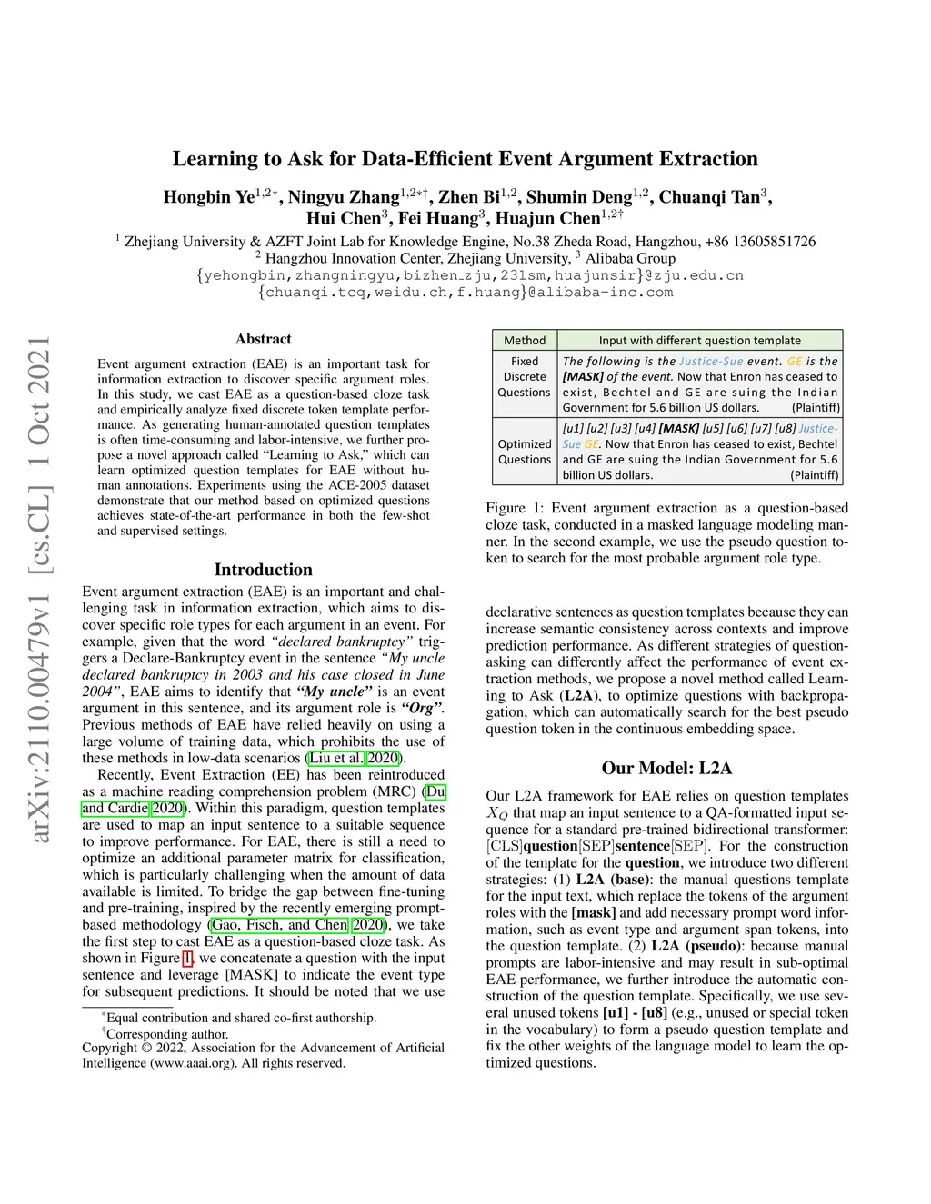 Event argument extraction (EAE) is an important task for information extraction to discover specific argument roles. In this study, we cast EAE as a question-based cloze task and empirically analyze fixed discrete token template performance. As generating human-annotated question templates is often time-consuming and labor-intensive, we further propose a novel approach called "Learning to Ask," which can learn optimized question templates for EAE without human annotations. Experiments using the ACE-2005 dataset demonstrate that our method based on optimized questions achieves state-of-the-art performance in both the few-shot and supervised settings.