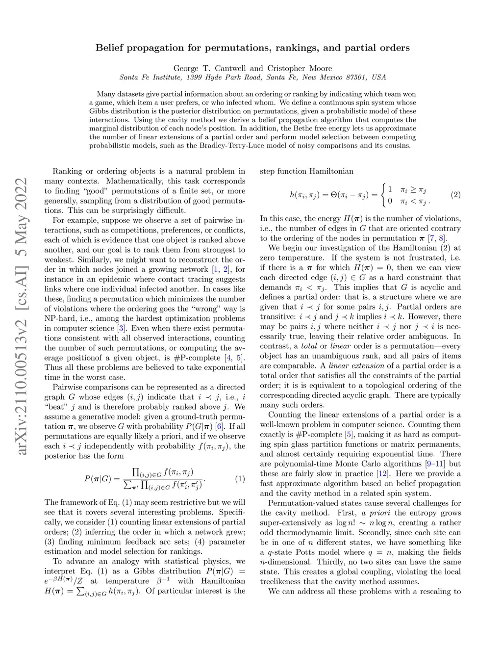 Many datasets give partial information about an ordering or ranking by indicating which team won a game, which item a user prefers, or who infected whom. We define a continuous spin system whose Gibbs distribution is the posterior distribution on permutations, given a probabilistic model of these interactions. Using the cavity method we derive a belief propagation algorithm that computes the marginal distribution of each node's position. In addition, the Bethe free energy lets us approximate the number of linear extensions of a partial order and perform model selection between competing probabilistic models, such as the Bradley-Terry-Luce model of noisy comparisons and its cousins.