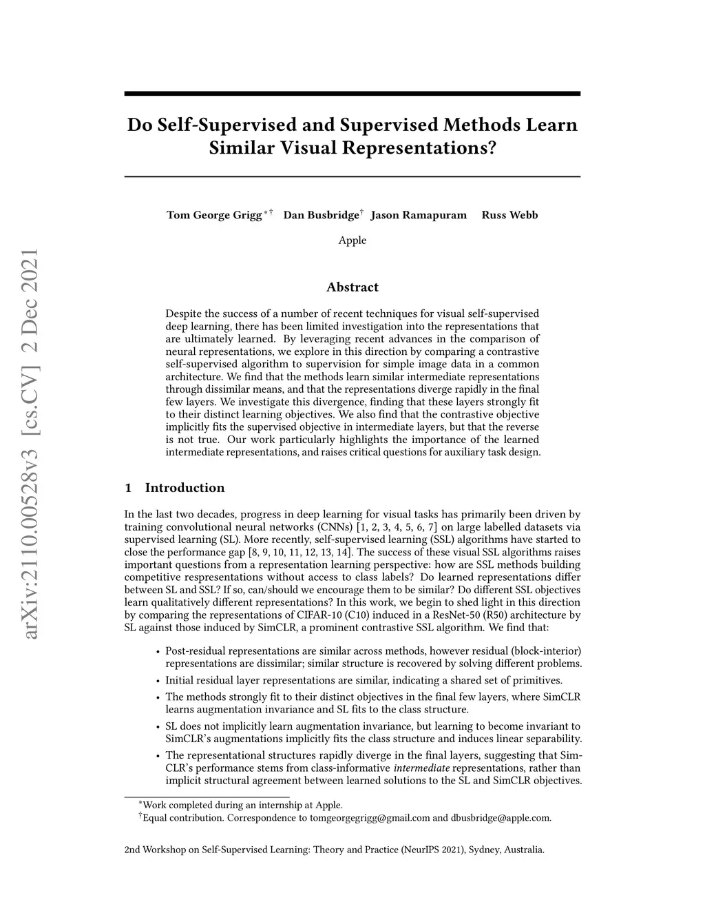 Despite the success of a number of recent techniques for visual self-supervised deep learning, there has been limited investigation into the representations that are ultimately learned. By leveraging recent advances in the comparison of neural representations, we explore in this direction by comparing a contrastive self-supervised algorithm to supervision for simple image data in a common architecture. We find that the methods learn similar intermediate representations through dissimilar means, and that the representations diverge rapidly in the final few layers. We investigate this divergence, finding that these layers strongly fit to their distinct learning objectives. We also find that the contrastive objective implicitly fits the supervised objective in intermediate layers, but that the reverse is not true. Our work particularly highlights the importance of the learned intermediate representations, and raises critical questions for auxiliary task design.