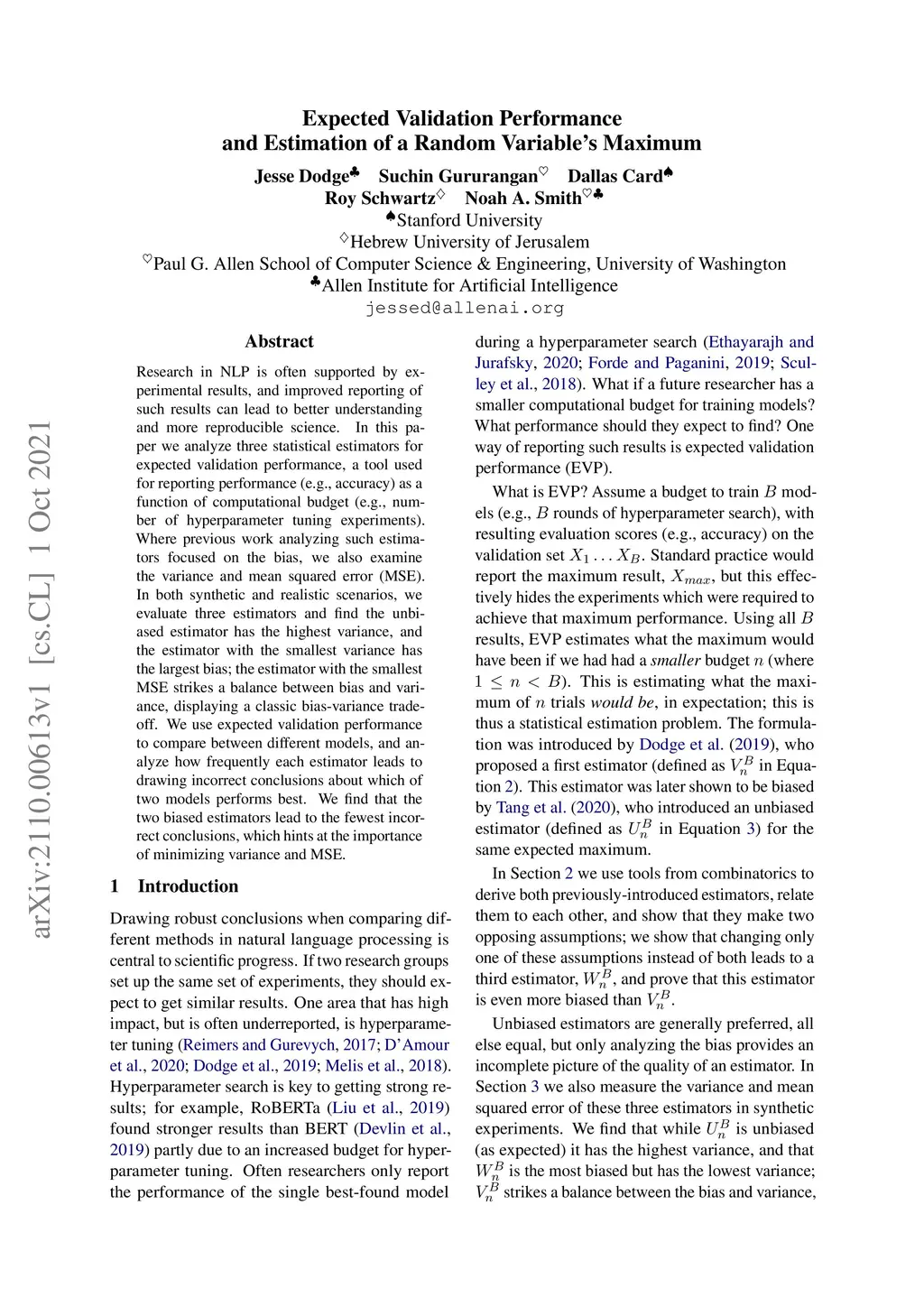 Research in NLP is often supported by experimental results, and improved reporting of such results can lead to better understanding and more reproducible science. In this paper we analyze three statistical estimators for expected validation performance, a tool used for reporting performance (e.g., accuracy) as a function of computational budget (e.g., number of hyperparameter tuning experiments). Where previous work analyzing such estimators focused on the bias, we also examine the variance and mean squared error (MSE). In both synthetic and realistic scenarios, we evaluate three estimators and find the unbiased estimator has the highest variance, and the estimator with the smallest variance has the largest bias; the estimator with the smallest MSE strikes a balance between bias and variance, displaying a classic bias-variance tradeoff. We use expected validation performance to compare between different models, and analyze how frequently each estimator leads to drawing incorrect conclusions about which of two models performs best. We find that the two biased estimators lead to the fewest incorrect conclusions, which hints at the importance of minimizing variance and MSE.