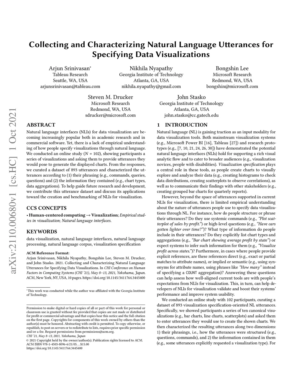 Natural language interfaces (NLIs) for data visualization are becoming increasingly popular both in academic research and in commercial software. Yet, there is a lack of empirical understanding of how people specify visualizations through natural language. To bridge this gap, we conducted an online study with 102 participants. We showed participants a series of ten visualizations for a given dataset and asked them to provide utterances they would pose to generate the displayed charts. The curated list of utterances generated from the study is provided below. This corpus of utterances can be used to evaluate existing NLIs for data visualization as well as for creating new systems and models to generate visualizations from natural language utterances.