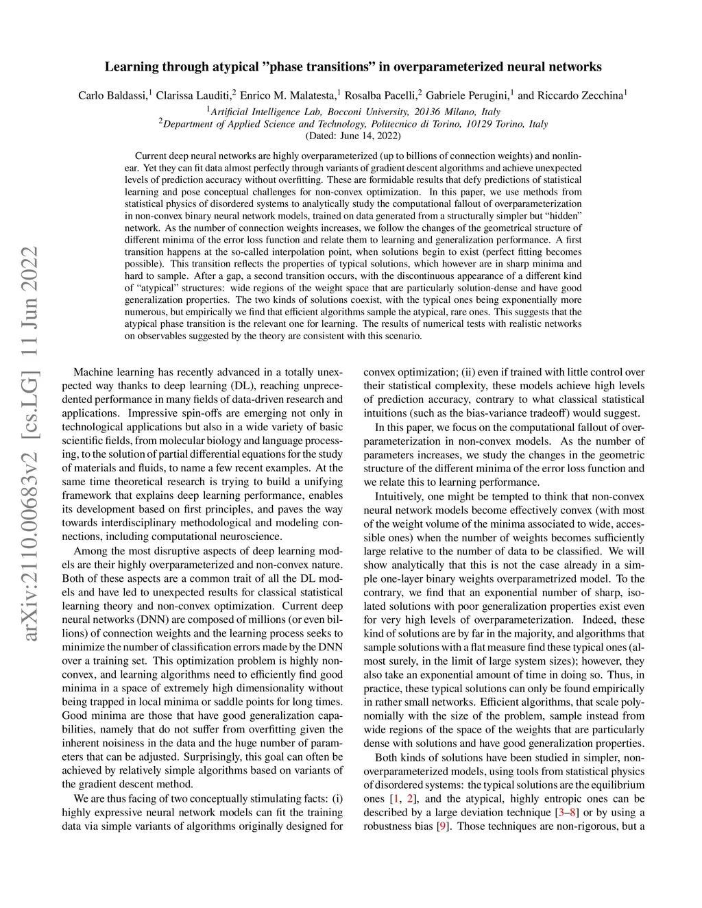 Current deep neural networks are highly overparameterized (up to billions of connection weights) and nonlinear. Yet they can fit data almost perfectly through variants of gradient descent algorithms and achieve unexpected levels of prediction accuracy without overfitting. These are formidable results that defy predictions of statistical learning and pose conceptual challenges for non-convex optimization. In this paper, we use methods from statistical physics of disordered systems to analytically study the computational fallout of overparameterization in non-convex binary neural network models, trained on data generated from a structurally simpler but "hidden" network. As the number of connection weights increases, we follow the changes of the geometrical structure of different minima of the error loss function and relate them to learning and generalization performance. A first transition happens at the so-called interpolation point, when solutions begin to exist (perfect fitting becomes possible). This transition reflects the properties of typical solutions, which however are in sharp minima and hard to sample. After a gap, a second transition occurs, with the discontinuous appearance of a different kind of "atypical" structures: wide regions of the weight space that are particularly solution-dense and have good generalization properties. The two kinds of solutions coexist, with the typical ones being exponentially more numerous, but empirically we find that efficient algorithms sample the atypical, rare ones. This suggests that the atypical phase transition is the relevant one for learning. The results of numerical tests with realistic networks on observables suggested by the theory are consistent with this scenario.