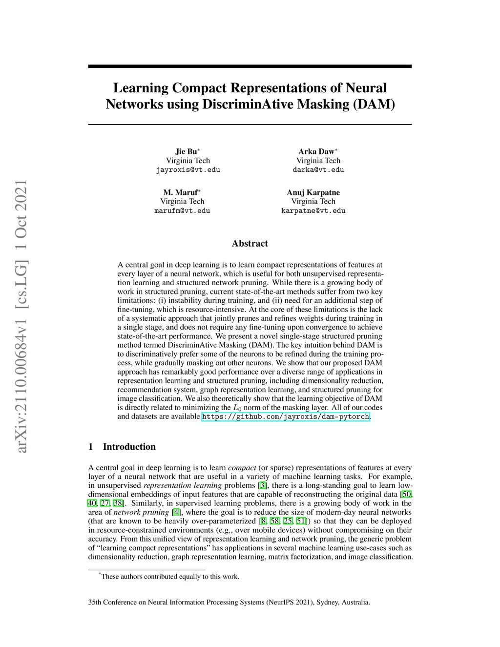 A central goal in deep learning is to learn compact representations of features at every layer of a neural network, which is useful for both unsupervised representation learning and structured network pruning. While there is a growing body of work in structured pruning, current state-of-the-art methods suffer from two key limitations: (i) instability during training, and (ii) need for an additional step of fine-tuning, which is resource-intensive. At the core of these limitations is the lack of a systematic approach that jointly prunes and refines weights during training in a single stage, and does not require any fine-tuning upon convergence to achieve state-of-the-art performance. We present a novel single-stage structured pruning method termed DiscriminAtive Masking (DAM). The key intuition behind DAM is to discriminatively prefer some of the neurons to be refined during the training process, while gradually masking out other neurons. We show that our proposed DAM approach has remarkably good performance over various applications, including dimensionality reduction, recommendation system, graph representation learning, and structured pruning for image classification. We also theoretically show that the learning objective of DAM is directly related to minimizing the L0 norm of the masking layer.