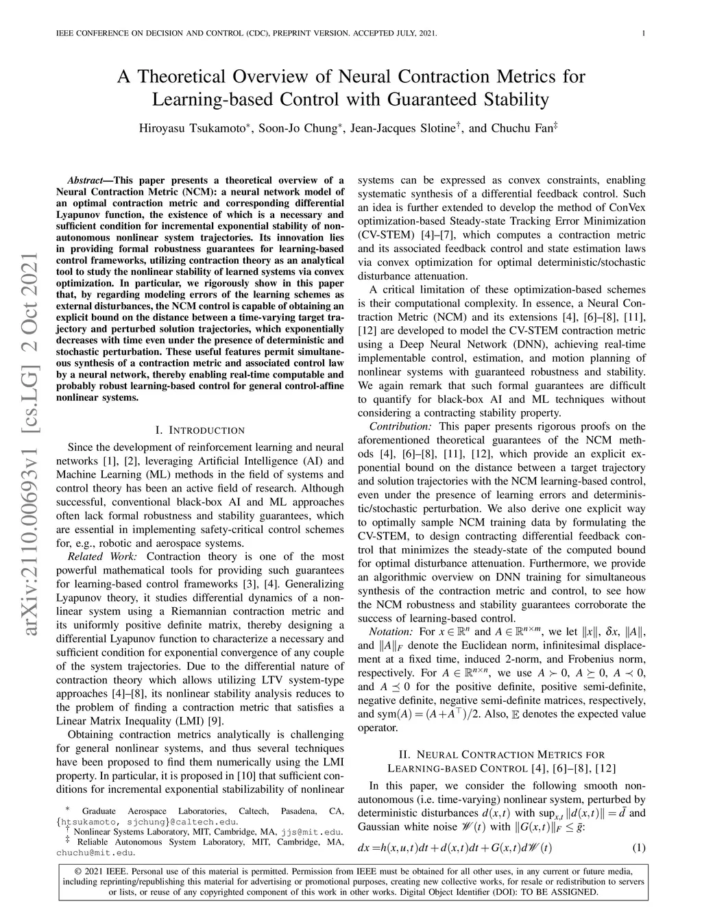 This paper presents a theoretical overview of a Neural Contraction Metric (NCM): a neural network model of an optimal contraction metric and corresponding differential Lyapunov function, the existence of which is a necessary and sufficient condition for incremental exponential stability of non-autonomous nonlinear system trajectories. Its innovation lies in providing formal robustness guarantees for learning-based control frameworks, utilizing contraction theory as an analytical tool to study the nonlinear stability of learned systems via convex optimization. In particular, we rigorously show in this paper that, by regarding modeling errors of the learning schemes as external disturbances, the NCM control is capable of obtaining an explicit bound on the distance between a time-varying target trajectory and perturbed solution trajectories, which exponentially decreases with time even under the presence of deterministic and stochastic perturbation. These useful features permit simultaneous synthesis of a contraction metric and associated control law by a neural network, thereby enabling real-time computable and probably robust learning-based control for general control-affine nonlinear systems.