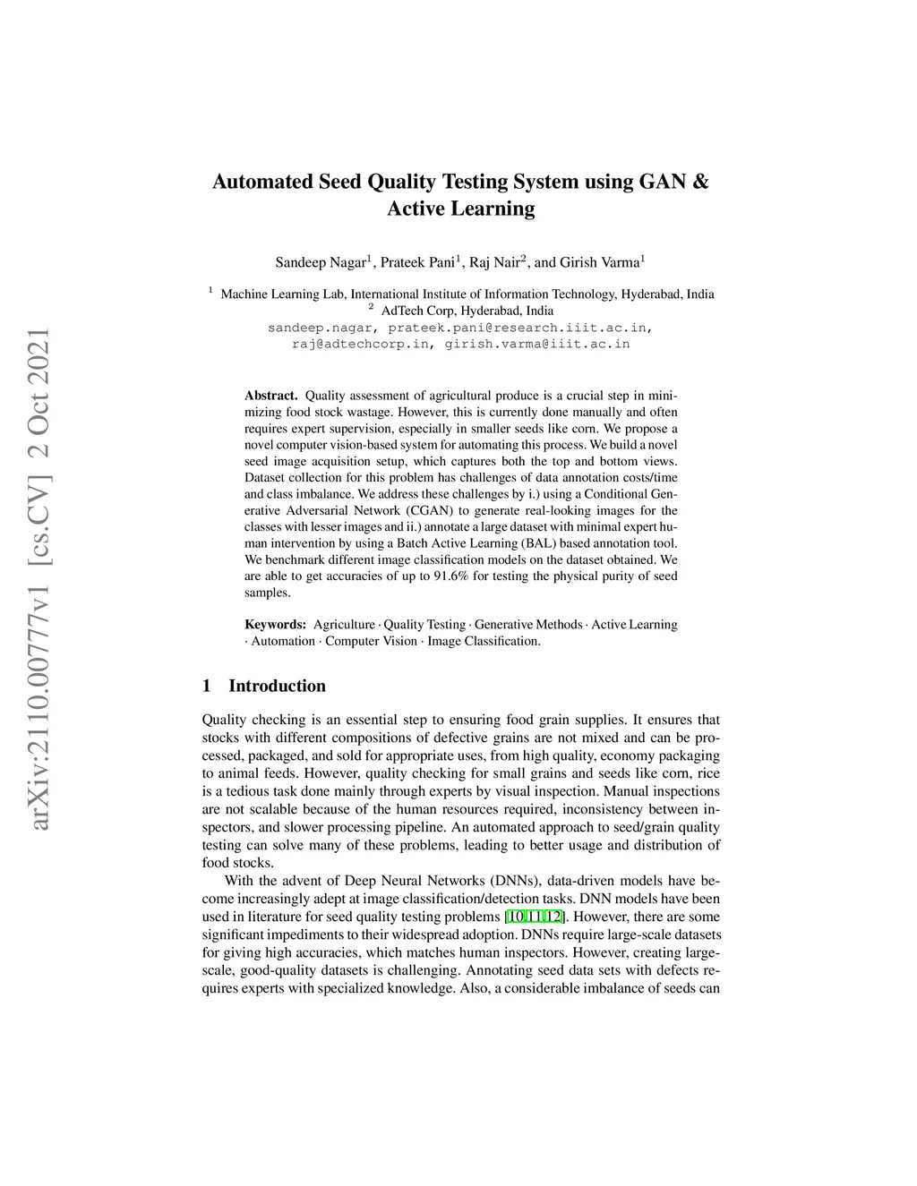 Quality assessment of agricultural produce is a crucial step in minimizing food stock wastage. However, this is currently done manually and often requires expert supervision, especially in smaller seeds like corn. We propose a novel computer vision-based system for automating this process. We build a novel seed image acquisition setup, which captures both the top and bottom views. Dataset collection for this problem has challenges of data annotation costs/time and class imbalance. We address these challenges by i.) using a Conditional Generative Adversarial Network (CGAN) to generate real-looking images for the classes with lesser images and ii.) annotate a large dataset with minimal expert human intervention by using a Batch Active Learning (BAL) based annotation tool. We benchmark different image classification models on the dataset obtained. We are able to get accuracies of up to 91.6% for testing the physical purity of seed samples.