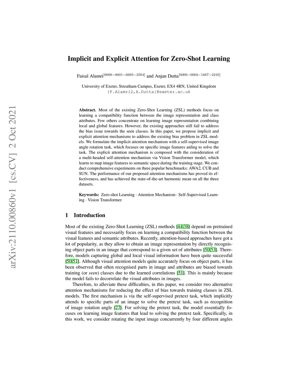 Most of the existing Zero-Shot Learning (ZSL) methods focus on learning a compatibility function between the image representation and class attributes. Few others concentrate on learning image representation combining local and global features. However, the existing approaches still fail to address the bias issue towards the seen classes. In this paper, we propose implicit and explicit attention mechanisms to address the existing bias problem in ZSL models. We formulate the implicit attention mechanism with a self-supervised image angle rotation task, which focuses on specific image features aiding to solve the task. The explicit attention mechanism is composed with the consideration of a multi-headed self-attention mechanism via Vision Transformer model, which learns to map image features to semantic space during the training stage. We conduct comprehensive experiments on three popular benchmarks: AWA2, CUB and SUN. The performance of our proposed attention mechanisms has proved its effectiveness, and has achieved the state-of-the-art harmonic mean on all the three datasets.