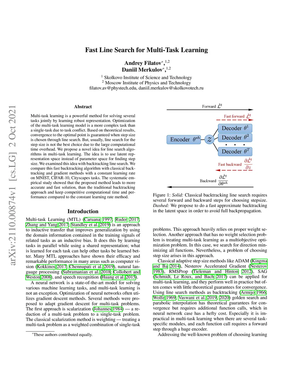 Multi-task learning is a powerful method for solving several tasks jointly by learning robust representation. Optimization of the multi-task learning model is a more complex task than a single-task due to task conflict. Based on theoretical results, convergence to the optimal point is guaranteed when step size is chosen through line search. But, usually, line search for the step size is not the best choice due to the large computational time overhead. We propose a novel idea for line search algorithms in multi-task learning. The idea is to use latent representation space instead of parameter space for finding step size. We examined this idea with backtracking line search. We compare this fast backtracking algorithm with classical backtracking and gradient methods with a constant learning rate on MNIST, CIFAR-10, Cityscapes tasks. The systematic empirical study showed that the proposed method leads to more accurate and fast solution, than the traditional backtracking approach and keep competitive computational time and performance compared to the constant learning rate method.