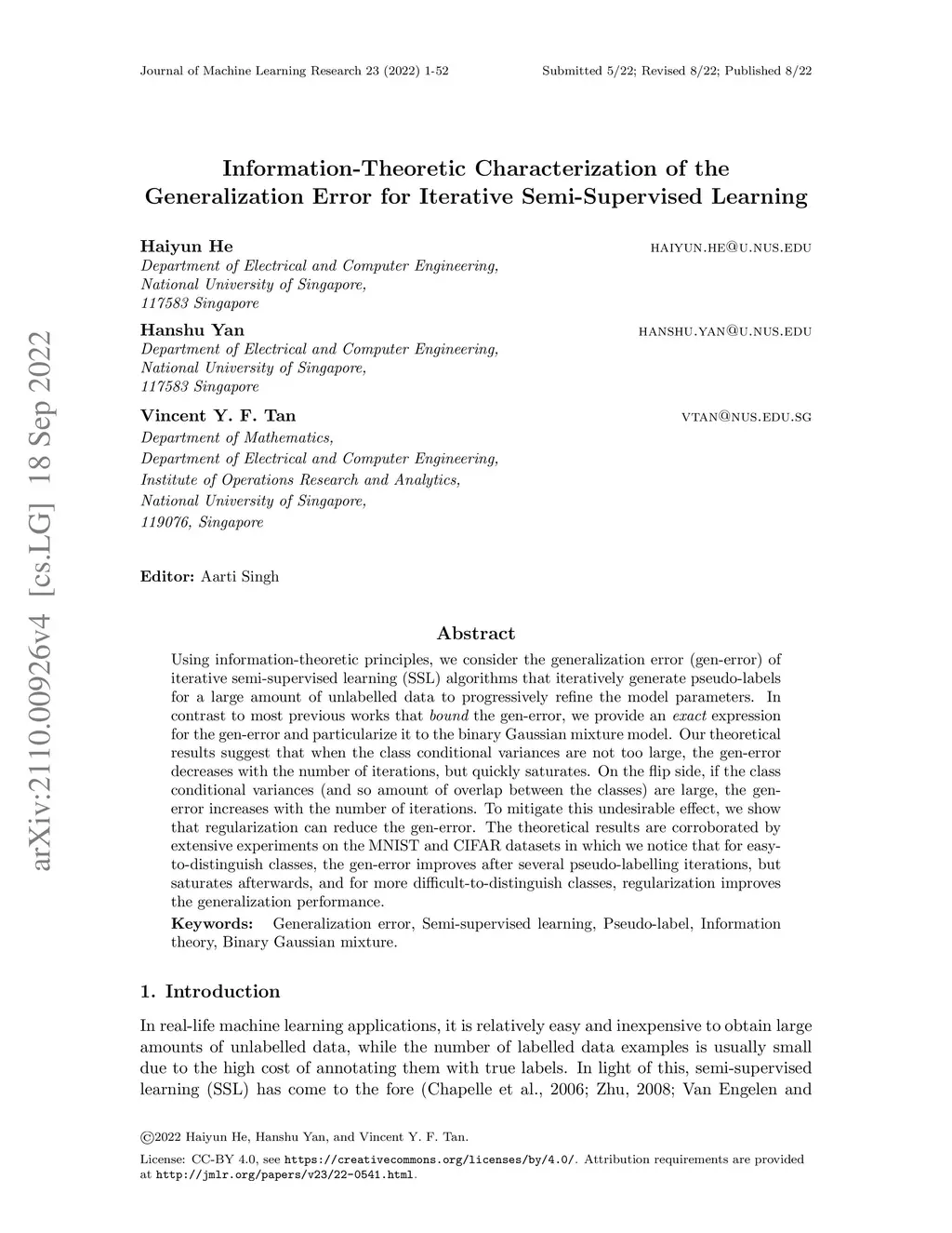 Using information-theoretic principles, we consider the generalization error (gen-error) of iterative semi-supervised learning (SSL) algorithms that iteratively generate pseudo-labels for a large amount of unlabelled data to progressively refine the model parameters. In contrast to most previous works that {\em bound} the gen-error, we provide an {\em exact} expression for the gen-error and particularize it to the binary Gaussian mixture model. Our theoretical results suggest that when the class conditional variances are not too large, the gen-error decreases with the number of iterations, but quickly saturates. On the flip side, if the class conditional variances (and so amount of overlap between the classes) are large, the gen-error increases with the number of iterations. To mitigate this undesirable effect, we show that regularization can reduce the gen-error. The theoretical results are corroborated by extensive experiments on the MNIST and CIFAR datasets in which we notice that for easy-to-distinguish classes, the gen-error improves after several pseudo-labelling iterations, but saturates afterwards, and for more difficult-to-distinguish classes, regularization improves the generalization performance.