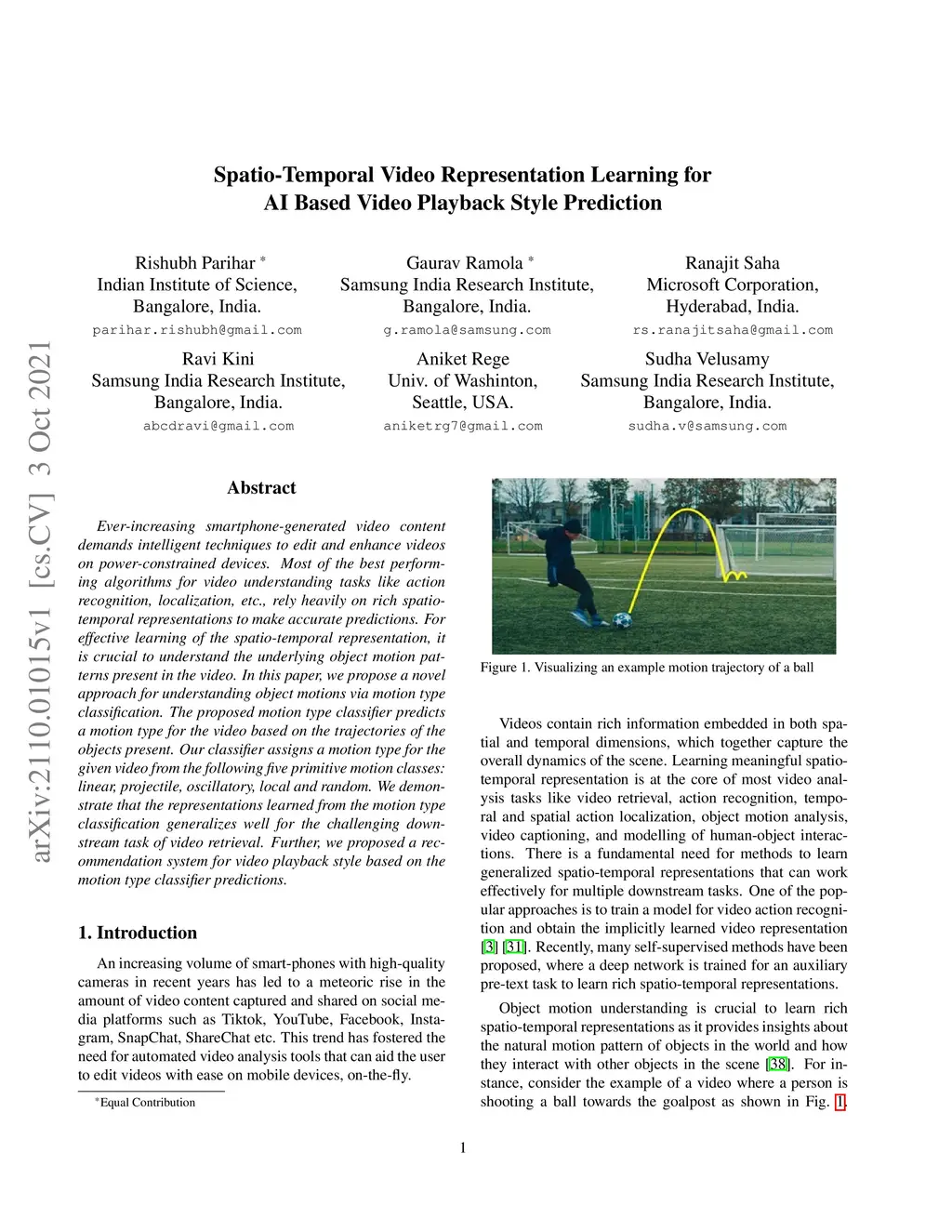 Ever-increasing smartphone-generated video content demands intelligent techniques to edit and enhance videos on power-constrained devices. Most of the best performing algorithms for video understanding tasks like action recognition, localization, etc., rely heavily on rich spatio-temporal representations to make accurate predictions. For effective learning of the spatio-temporal representation, it is crucial to understand the underlying object motion patterns present in the video. In this paper, we propose a novel approach for understanding object motions via motion type classification. The proposed motion type classifier predicts a motion type for the video based on the trajectories of the objects present. Our classifier assigns a motion type for the given video from the following five primitive motion classes: linear, projectile, oscillatory, local and random. We demonstrate that the representations learned from the motion type classification generalizes well for the challenging downstream task of video retrieval. Further, we proposed a recommendation system for video playback style based on the motion type classifier predictions.