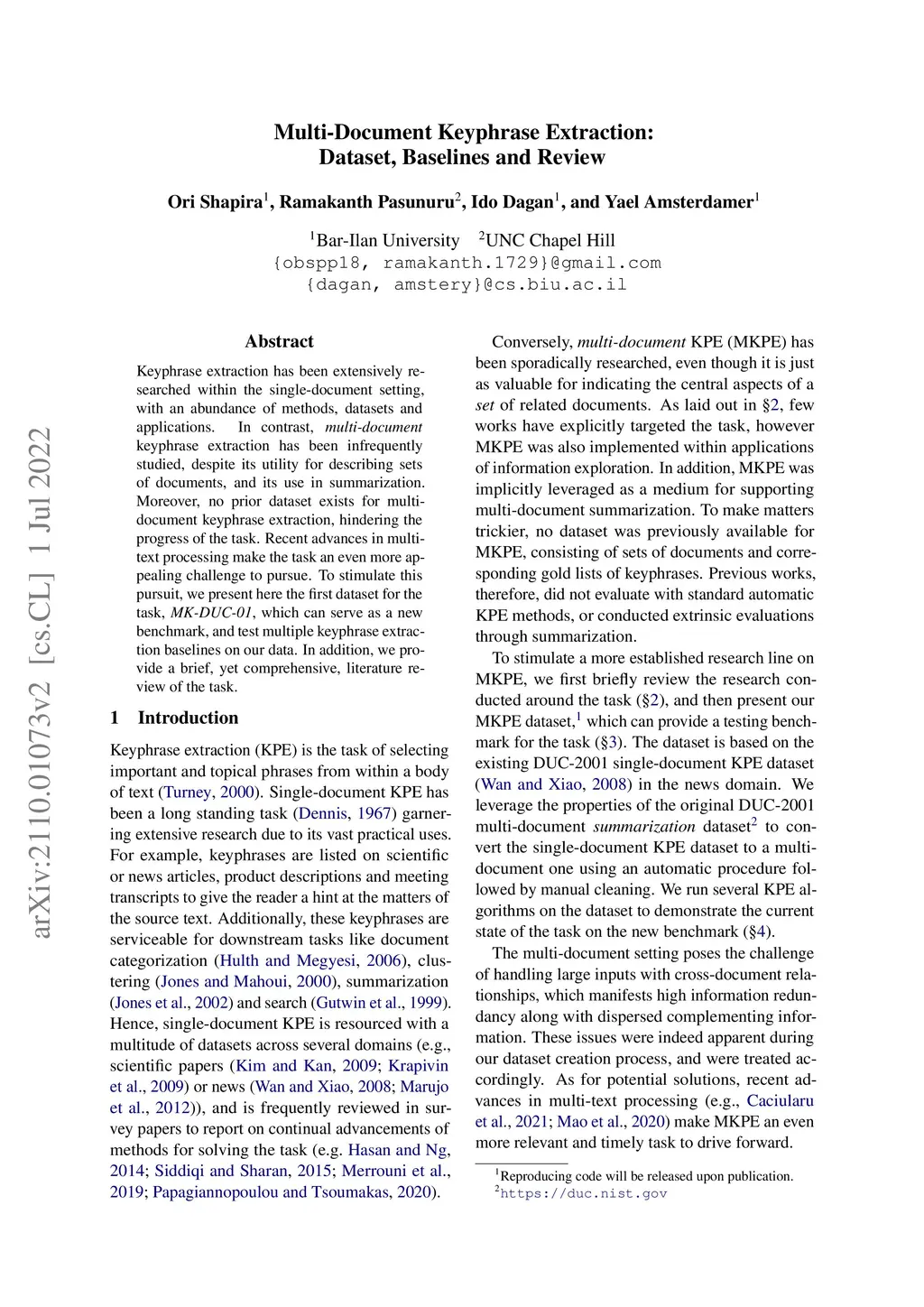 Multi-Document Keyphrase Extraction: Dataset, Baselines and Review