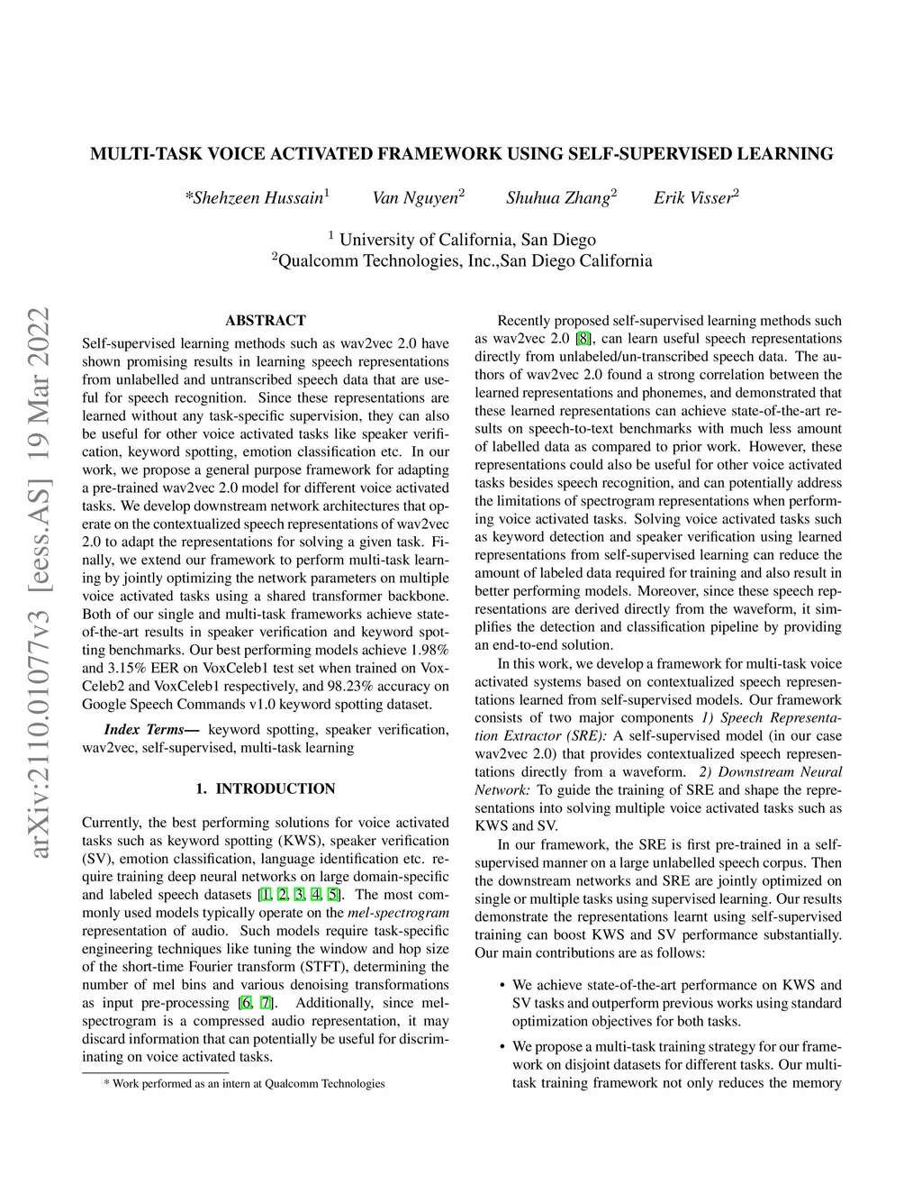 Multi-task Voice Activated Framework using Self-supervised Learning