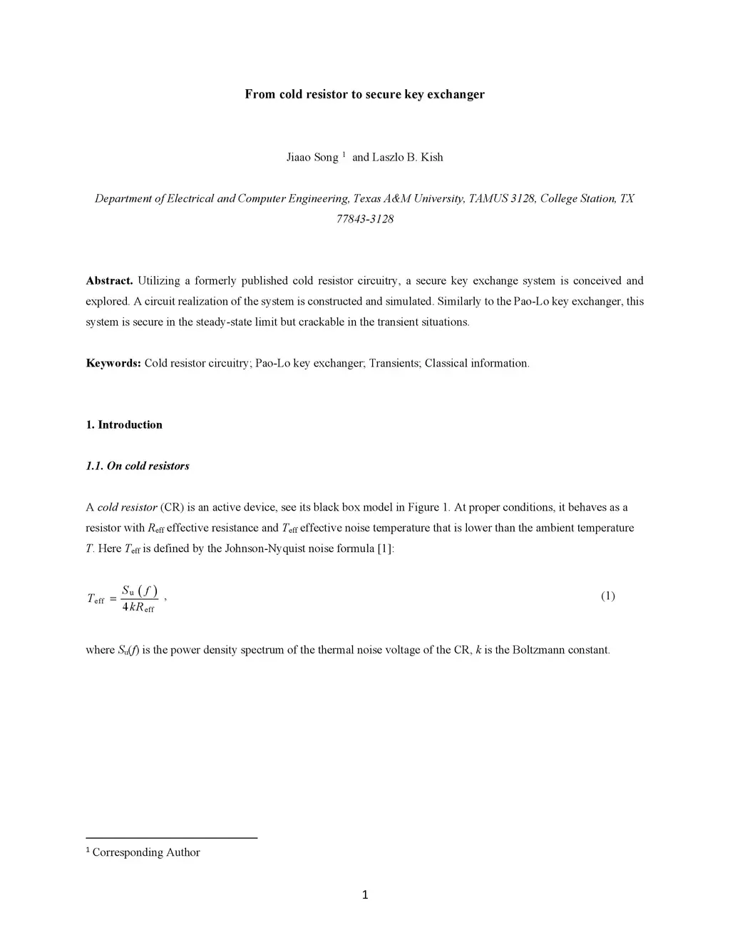 Utilizing a formerly published cold resistor circuitry, a secure key exchange system is conceived and explored. A circuit realization of the system is constructed and simulated. Similarly to the Pao-Lo key exchanger, this system is secure in the steady-state limit but crackable in the transient situations.