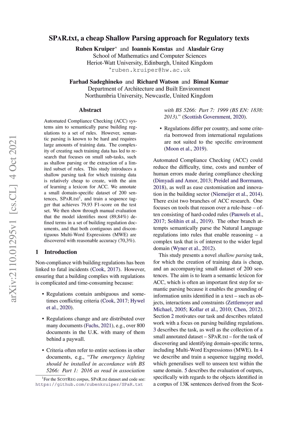 Automated Compliance Checking (ACC) systems aim to semantically parse building regulations to a set of rules. However, semantic parsing is known to be hard and requires large amounts of training data. The complexity of creating such training data has led to research that focuses on small sub-tasks, such as shallow parsing or the extraction of a limited subset of rules. This study introduces a shallow parsing task for which training data is relatively cheap to create, with the aim of learning a lexicon for ACC. We annotate a small domain-specific dataset of 200 sentences, SPaR.txt, and train a sequence tagger that achieves 79,93 F1-score on the test set. We then show through manual evaluation that the model identifies most (89,84%) defined terms in a set of building regulation documents, and that both contiguous and discontiguous Multi-Word Expressions (MWE) are discovered with reasonable accuracy (70,3%).
