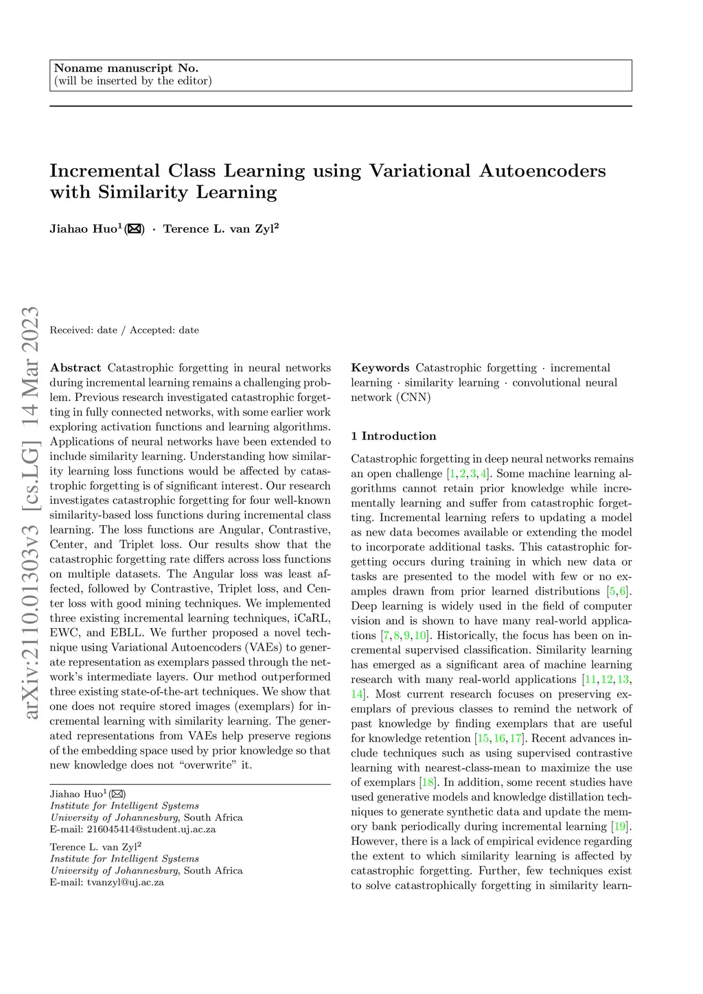 Catastrophic forgetting in neural networks during incremental learning remains a challenging problem. Previous research investigated catastrophic forgetting in fully connected networks, with some earlier work exploring activation functions and learning algorithms. Applications of neural networks have been extended to include similarity learning. Understanding how similarity learning loss functions would be affected by catastrophic forgetting is of significant interest. Our research investigates catastrophic forgetting for four well-known similarity-based loss functions during incremental class learning. The loss functions are Angular, Contrastive, Center, and Triplet loss. Our results show that the catastrophic forgetting rate differs across loss functions on multiple datasets. The Angular loss was least affected, followed by Contrastive, Triplet loss, and Center loss with good mining techniques. We implemented three existing incremental learning techniques, iCaRL, EWC, and EBLL. We further proposed a novel technique using Variational Autoencoders (VAEs) to generate representation as exemplars passed through the network's intermediate layers. Our method outperformed three existing state-of-the-art techniques. We show that one does not require stored images (exemplars) for incremental learning with similarity learning. The generated representations from VAEs help preserve regions of the embedding space used by prior knowledge so that new knowledge does not ``overwrite'' it.