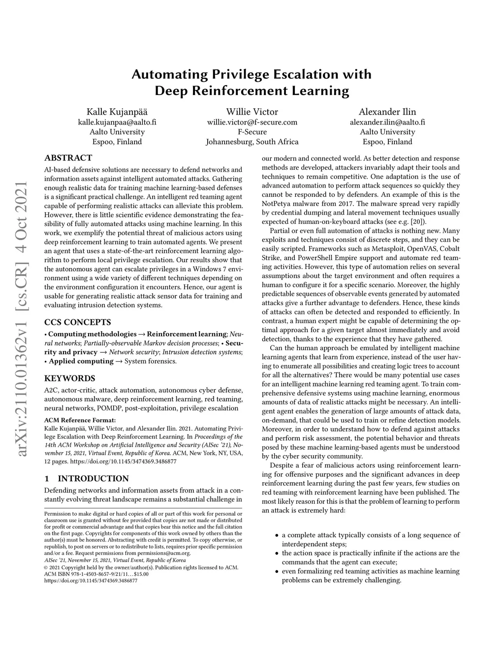 AI-based defensive solutions are necessary to defend networks and information assets against intelligent automated attacks. Gathering enough realistic data for training machine learning-based defenses is a significant practical challenge. An intelligent red teaming agent capable of performing realistic attacks can alleviate this problem. However, there is little scientific evidence demonstrating the feasibility of fully automated attacks using machine learning. In this work, we exemplify the potential threat of malicious actors using deep reinforcement learning to train automated agents. We present an agent that uses a state-of-the-art reinforcement learning algorithm to perform local privilege escalation. Our results show that the autonomous agent can escalate privileges in a Windows 7 environment using a wide variety of different techniques depending on the environment configuration it encounters. Hence, our agent is usable for generating realistic attack sensor data for training and evaluating intrusion detection systems.