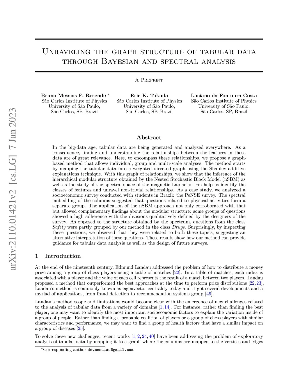 In the big-data age tabular datasets are being generated and analyzed everywhere. As a consequence, finding and understanding the relationships between the features of these datasets are of great relevance. Here, to encompass these relationships we propose a methodology that maps an entire tabular dataset or just an observation into a weighted directed graph using the Shapley additive explanations technique. With this graph of relationships, we show that the inference of the hierarchical modular structure obtained by the nested stochastic block model (nSBM) as well as the study of the spectral space of the magnetic Laplacian can help us identify the classes of features and unravel non-trivial relationships. As a case study, we analyzed a socioeconomic survey conducted with students in Brazil: the PeNSE survey. The spectral embedding of the columns suggested that questions related to physical activities form a separate group. The application of the nSBM approach, corroborated with that and allowed complementary findings about the modular structure: some groups of questions showed a high adherence with the divisions qualitatively defined by the designers of the survey. However, questions from the class \textit{Safety} were partly grouped by our method in the class \textit{Drugs}. Surprisingly, by inspecting these questions, we observed that they were related to both these topics, suggesting an alternative interpretation of these questions. Our method can provide guidance for tabular data analysis as well as the design of future surveys.