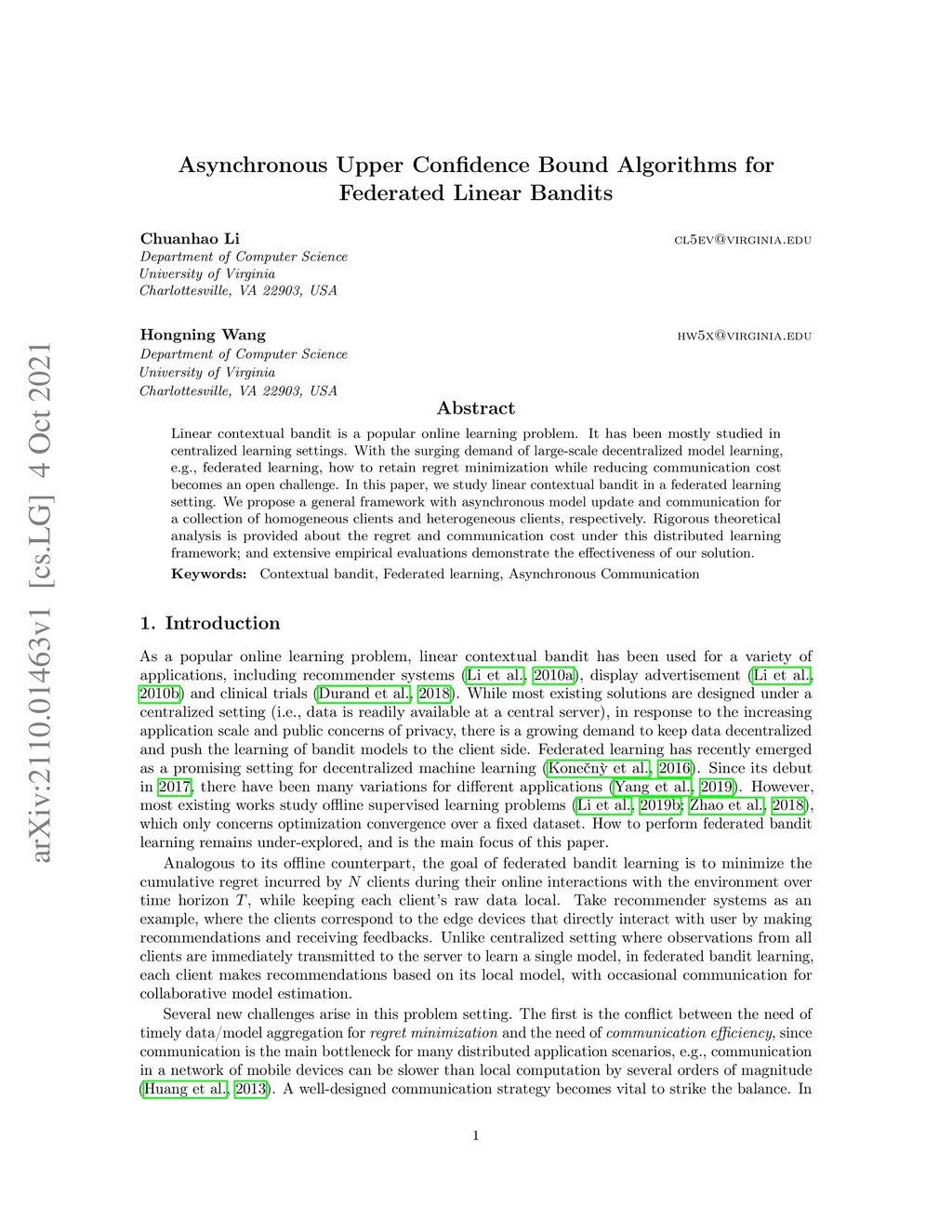 Linear contextual bandit is a popular online learning problem. It has been mostly studied in centralized learning settings. With the surging demand of large-scale decentralized model learning, e.g., federated learning, how to retain regret minimization while reducing communication cost becomes an open challenge. In this paper, we study linear contextual bandit in a federated learning setting. We propose a general framework with asynchronous model update and communication for a collection of homogeneous clients and heterogeneous clients, respectively. Rigorous theoretical analysis is provided about the regret and communication cost under this distributed learning framework; and extensive empirical evaluations demonstrate the effectiveness of our solution.
