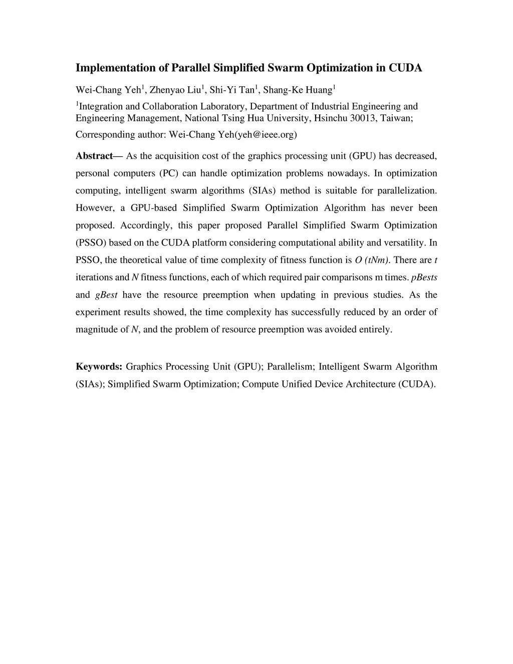 Implementation of Parallel Simplified Swarm Optimization in CUDA