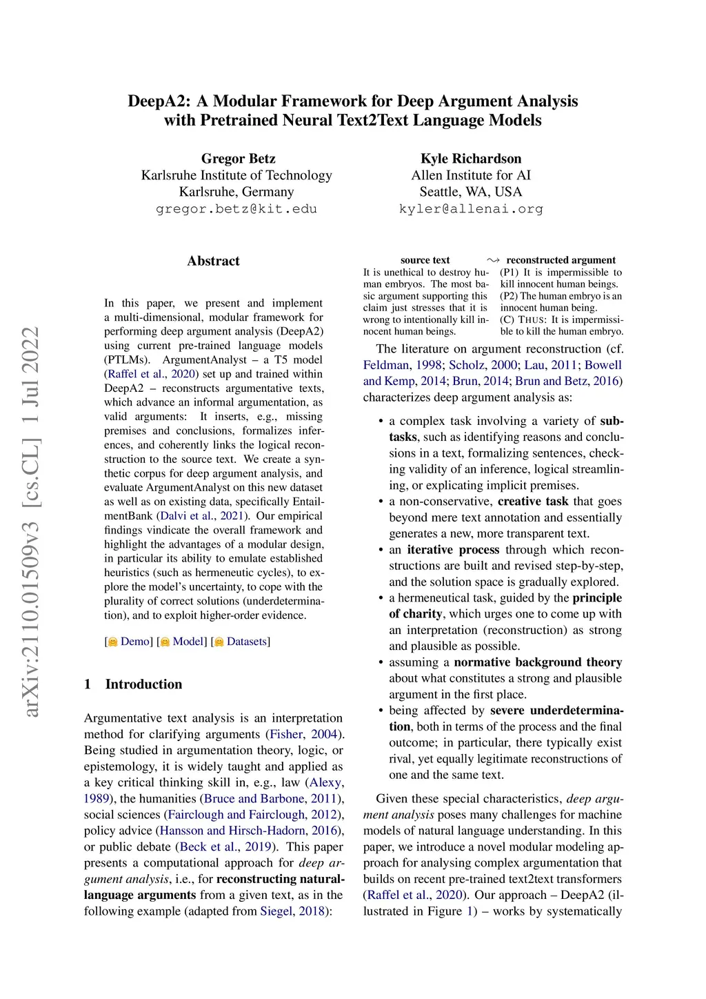 In this paper, we present and implement a multi-dimensional, modular framework for performing deep argument analysis (DeepA2) using current pre-trained language models (PTLMs). ArgumentAnalyst -- a T5 model (Raffel et al. 2020) set up and trained within DeepA2 -- reconstructs argumentative texts, which advance an informal argumentation, as valid arguments: It inserts, e.g., missing premises and conclusions, formalizes inferences, and coherently links the logical reconstruction to the source text. We create a synthetic corpus for deep argument analysis, and evaluate ArgumentAnalyst on this new dataset as well as on existing data, specifically EntailmentBank (Dalvi et al. 2021). Our empirical findings vindicate the overall framework and highlight the advantages of a modular design, in particular its ability to emulate established heuristics (such as hermeneutic cycles), to explore the model's uncertainty, to cope with the plurality of correct solutions (underdetermination), and to exploit higher-order evidence.