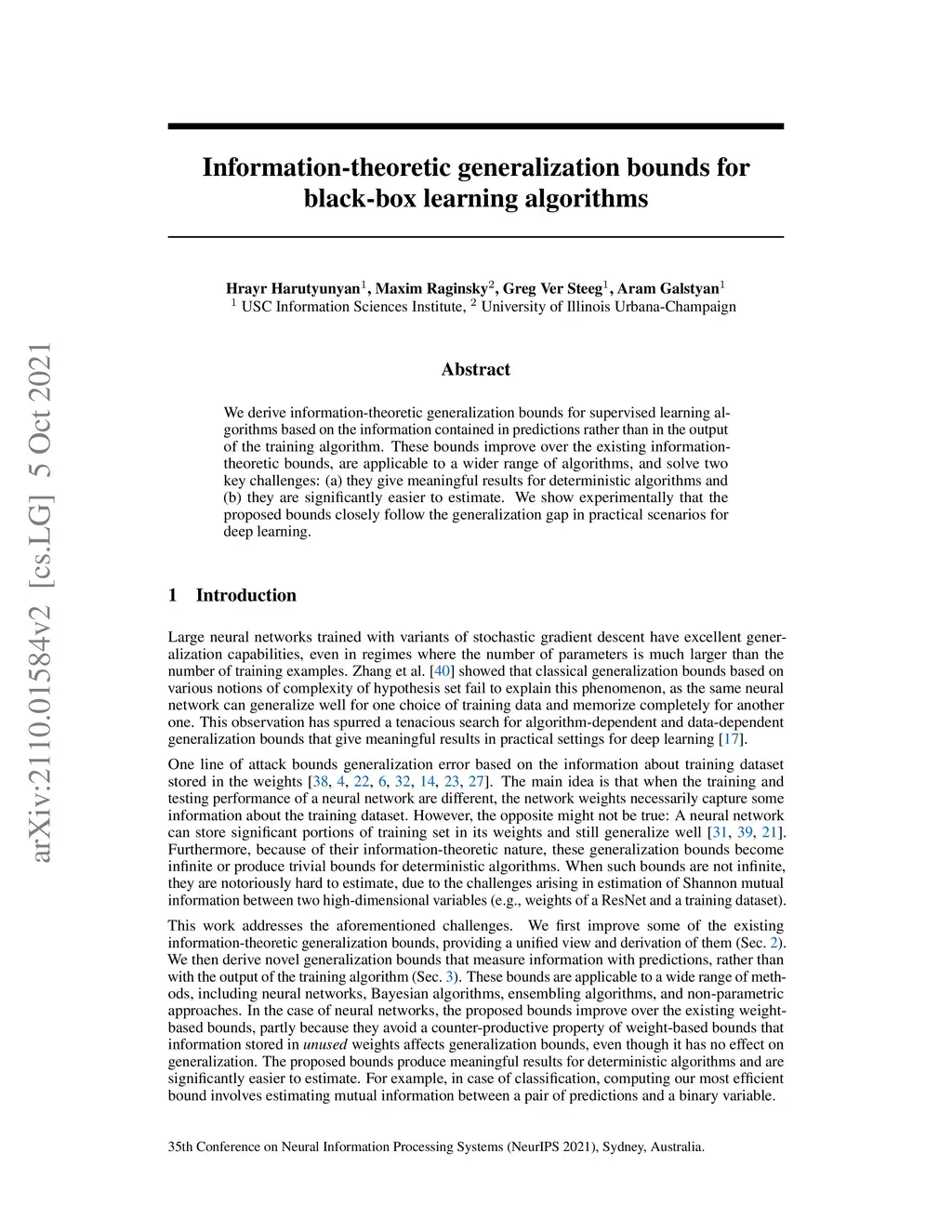 We derive information-theoretic generalization bounds for supervised learning algorithms based on the information contained in predictions rather than in the output of the training algorithm. These bounds improve over the existing information-theoretic bounds, are applicable to a wider range of algorithms, and solve two key challenges: (a) they give meaningful results for deterministic algorithms and (b) they are significantly easier to estimate. We show experimentally that the proposed bounds closely follow the generalization gap in practical scenarios for deep learning.
