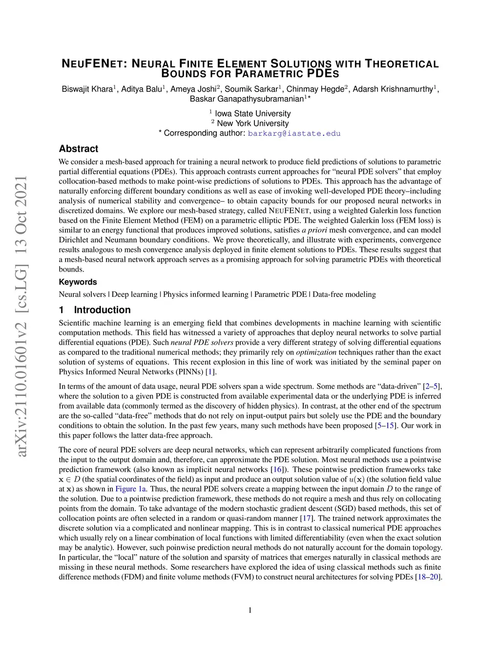 We consider a mesh-based approach for training a neural network to produce field predictions of solutions to parametric partial differential equations (PDEs). This approach contrasts current approaches for "neural PDE solvers" that employ collocation-based methods to make point-wise predictions of solutions to PDEs. This approach has the advantage of naturally enforcing different boundary conditions as well as ease of invoking well-developed PDE theory -- including analysis of numerical stability and convergence -- to obtain capacity bounds for our proposed neural networks in discretized domains. We explore our mesh-based strategy, called NeuFENet, using a weighted Galerkin loss function based on the Finite Element Method (FEM) on a parametric elliptic PDE. The weighted Galerkin loss (FEM loss) is similar to an energy functional that produces improved solutions, satisfies a priori mesh convergence, and can model Dirichlet and Neumann boundary conditions. We prove theoretically, and illustrate with experiments, convergence results analogous to mesh convergence analysis deployed in finite element solutions to PDEs. These results suggest that a mesh-based neural network approach serves as a promising approach for solving parametric PDEs with theoretical bounds.