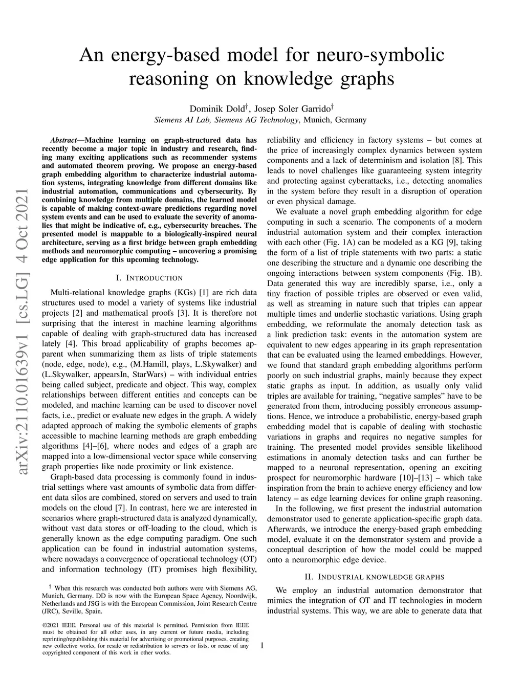 Machine learning on graph-structured data has recently become a major topic in industry and research, finding many exciting applications such as recommender systems and automated theorem proving. We propose an energy-based graph embedding algorithm to characterize industrial automation systems, integrating knowledge from different domains like industrial automation, communications and cybersecurity. By combining knowledge from multiple domains, the learned model is capable of making context-aware predictions regarding novel system events and can be used to evaluate the severity of anomalies that might be indicative of, e.g., cybersecurity breaches. The presented model is mappable to a biologically-inspired neural architecture, serving as a first bridge between graph embedding methods and neuromorphic computing - uncovering a promising edge application for this upcoming technology.