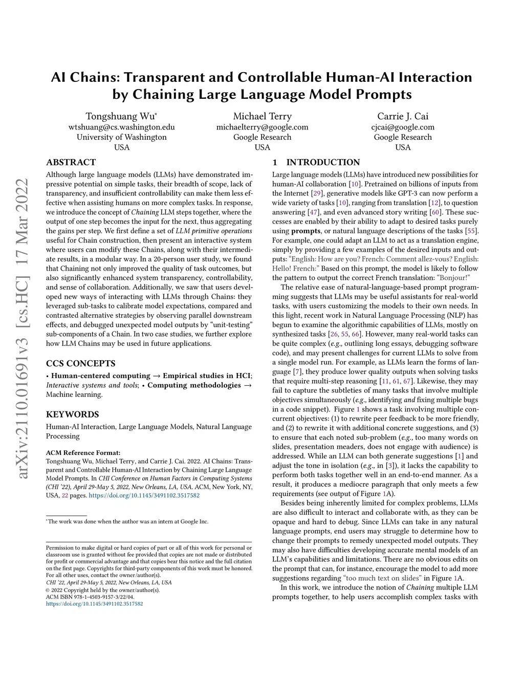 Although large language models (LLMs) have demonstrated impressive potential on simple tasks, their breadth of scope, lack of transparency, and insufficient controllability can make them less effective when assisting humans on more complex tasks. In response, we introduce the concept of Chaining LLM steps together, where the output of one step becomes the input for the next, thus aggregating the gains per step. We first define a set of LLM primitive operations useful for Chain construction, then present an interactive system where users can modify these Chains, along with their intermediate results, in a modular way. In a 20-person user study, we found that Chaining not only improved the quality of task outcomes, but also significantly enhanced system transparency, controllability, and sense of collaboration. Additionally, we saw that users developed new ways of interacting with LLMs through Chains: they leveraged sub-tasks to calibrate model expectations, compared and contrasted alternative strategies by observing parallel downstream effects, and debugged unexpected model outputs by "unit-testing" sub-components of a Chain. In two case studies, we further explore how LLM Chains may be used in future applications