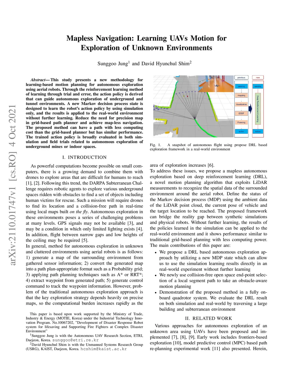 This study presents a new methodology for learning-based motion planning for autonomous exploration using aerial robots. Through the reinforcement learning method of learning through trial and error, the action policy is derived that can guide autonomous exploration of underground and tunnel environments. A new Markov decision process state is designed to learn the robot's action policy by using simulation only, and the results are applied to the real-world environment without further learning. Reduce the need for the precision map in grid-based path planner and achieve map-less navigation. The proposed method can have a path with less computing cost than the grid-based planner but has similar performance. The trained action policy is broadly evaluated in both simulation and field trials related to autonomous exploration of underground mines or indoor spaces.