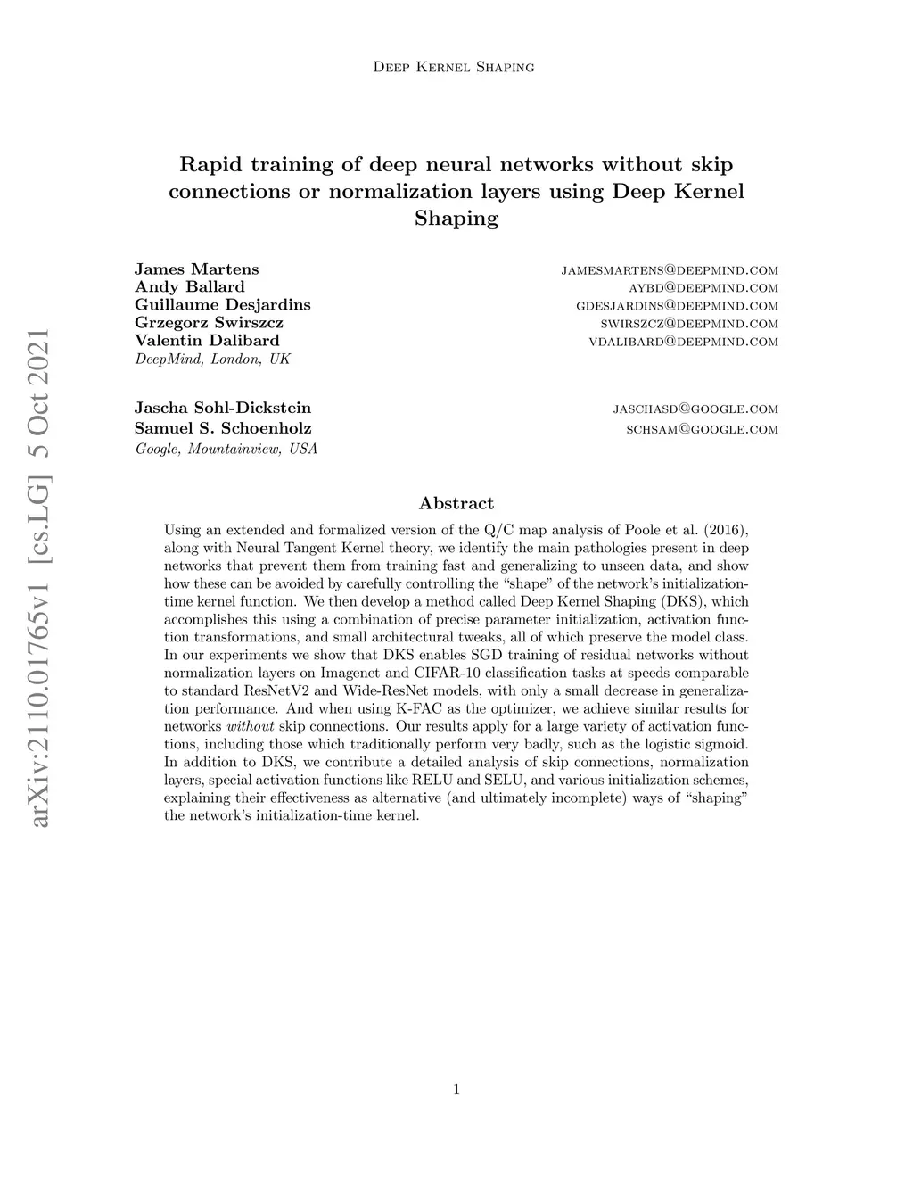Using an extended and formalized version of the Q/C map analysis of Poole et al. (2016), along with Neural Tangent Kernel theory, we identify the main pathologies present in deep networks that prevent them from training fast and generalizing to unseen data, and show how these can be avoided by carefully controlling the "shape" of the network's initialization-time kernel function. We then develop a method called Deep Kernel Shaping (DKS), which accomplishes this using a combination of precise parameter initialization, activation function transformations, and small architectural tweaks, all of which preserve the model class. In our experiments we show that DKS enables SGD training of residual networks without normalization layers on Imagenet and CIFAR-10 classification tasks at speeds comparable to standard ResNetV2 and Wide-ResNet models, with only a small decrease in generalization performance. And when using K-FAC as the optimizer, we achieve similar results for networks without skip connections. Our results apply for a large variety of activation functions, including those which traditionally perform very badly, such as the logistic sigmoid. In addition to DKS, we contribute a detailed analysis of skip connections, normalization layers, special activation functions like RELU and SELU, and various initialization schemes, explaining their effectiveness as alternative (and ultimately incomplete) ways of "shaping" the network's initialization-time kernel.
