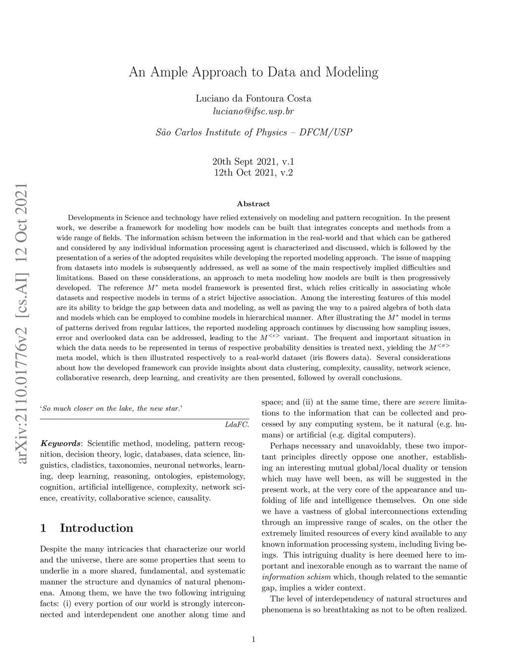 In the present work, we describe a framework for modeling how models can be built that integrates concepts and methods from a wide range of fields. The information schism between the real-world and that which can be gathered and considered by any individual information processing agent is characterized and discussed, which is followed by the presentation of a series of the adopted requisites while developing the modeling approach. The issue of mapping from datasets into models is subsequently addressed, as well as some of the respectively implied difficulties and limitations. Based on these considerations, an approach to meta modeling how models are built is then progressively developed. First, the reference M^* meta model framework is presented, which relies critically in associating whole datasets and respective models in terms of a strict equivalence relation. Among the interesting features of this model are its ability to bridge the gap between data and modeling, as well as paving the way to an algebra of both data and models which can be employed to combine models into hierarchical manner. After illustrating the M* model in terms of patterns derived from regular lattices, the reported modeling approach continues by discussing how sampling issues, error and overlooked data can be addressed, leading to the variant. The situation in which the data needs to be represented in terms of respective probability densities is treated next, yielding the meta model, which is then illustrated respectively to a real-world dataset (iris flowers data). Several considerations about how the developed framework can provide insights about data clustering, complexity, collaborative research, deep learning, and creativity are then presented, followed by overall conclusions.