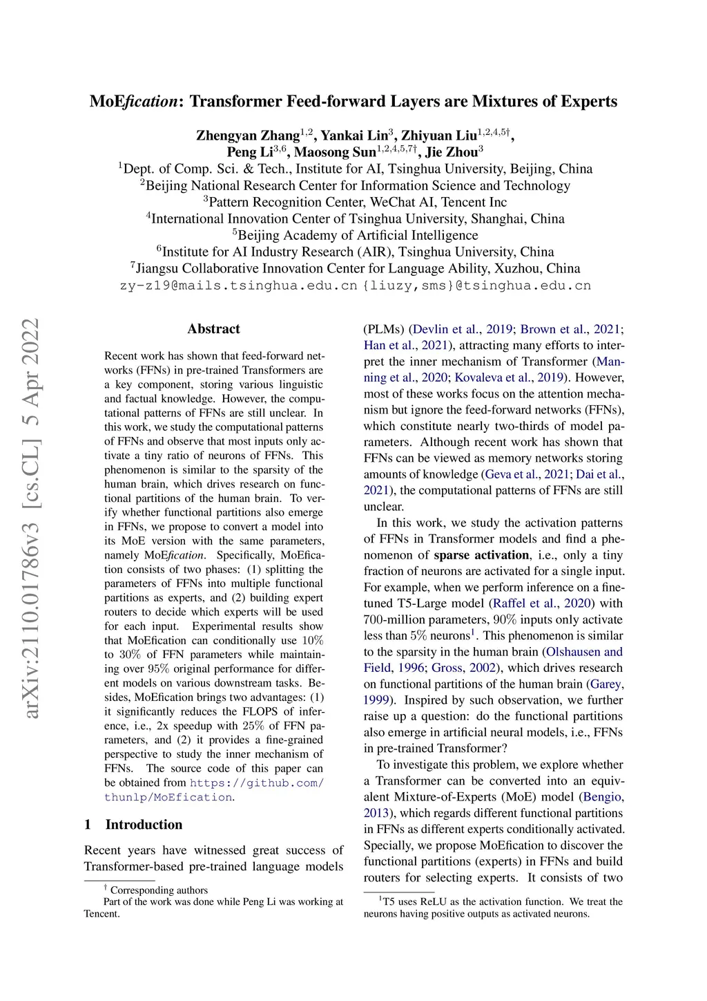 Recent work has shown that feed-forward networks (FFNs) in pre-trained Transformers are a key component, storing various linguistic and factual knowledge. However, the computational patterns of FFNs are still unclear. In this work, we study the computational patterns of FFNs and observe that most inputs only activate a tiny ratio of neurons of FFNs. This phenomenon is similar to the sparsity of the human brain, which drives research on functional partitions of the human brain. To verify whether functional partitions also emerge in FFNs, we propose to convert a model into its MoE version with the same parameters, namely MoEfication. Specifically, MoEfication consists of two phases: (1) splitting the parameters of FFNs into multiple functional partitions as experts, and (2) building expert routers to decide which experts will be used for each input. Experimental results show that MoEfication can conditionally use 10% to 30% of FFN parameters while maintaining over 95% original performance for different models on various downstream tasks. Besides, MoEfication brings two advantages: (1) it significantly reduces the FLOPS of inference, i.e., 2x speedup with 25% of FFN parameters, and (2) it provides a fine-grained perspective to study the inner mechanism of FFNs. The source code of this paper can be obtained from https://github.com/thunlp/MoEfication.