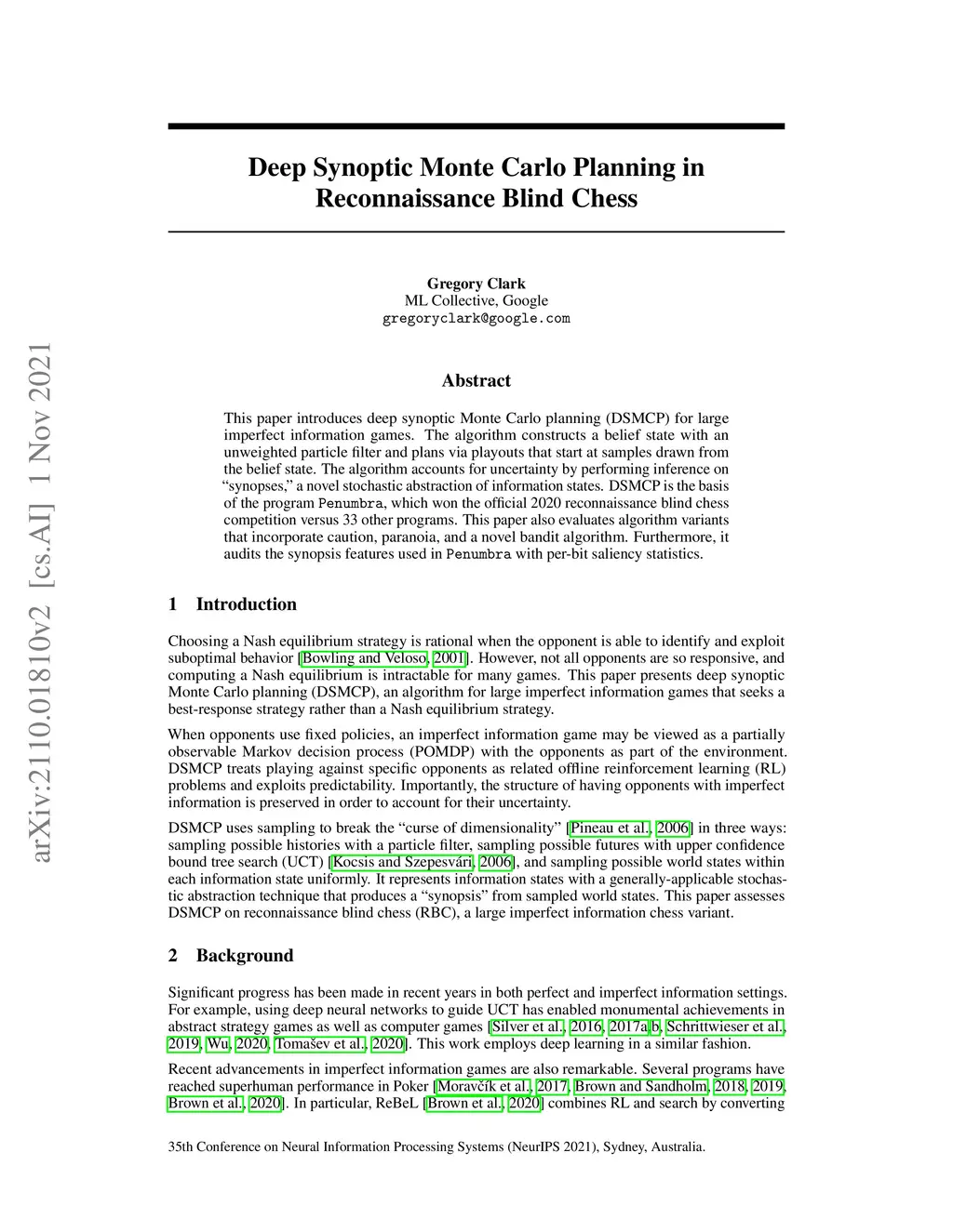 This paper introduces deep synoptic Monte Carlo planning (DSMCP) for large imperfect information games. The algorithm constructs a belief state with an unweighted particle filter and plans via playouts that start at samples drawn from the belief state. The algorithm accounts for uncertainty by performing inference on "synopses," a novel stochastic abstraction of information states. DSMCP is the basis of the program Penumbra, which won the official 2020 reconnaissance blind chess competition versus 33 other programs. This paper also evaluates algorithm variants that incorporate caution, paranoia, and a novel bandit algorithm. Furthermore, it audits the synopsis features used in Penumbra with per-bit saliency statistics.