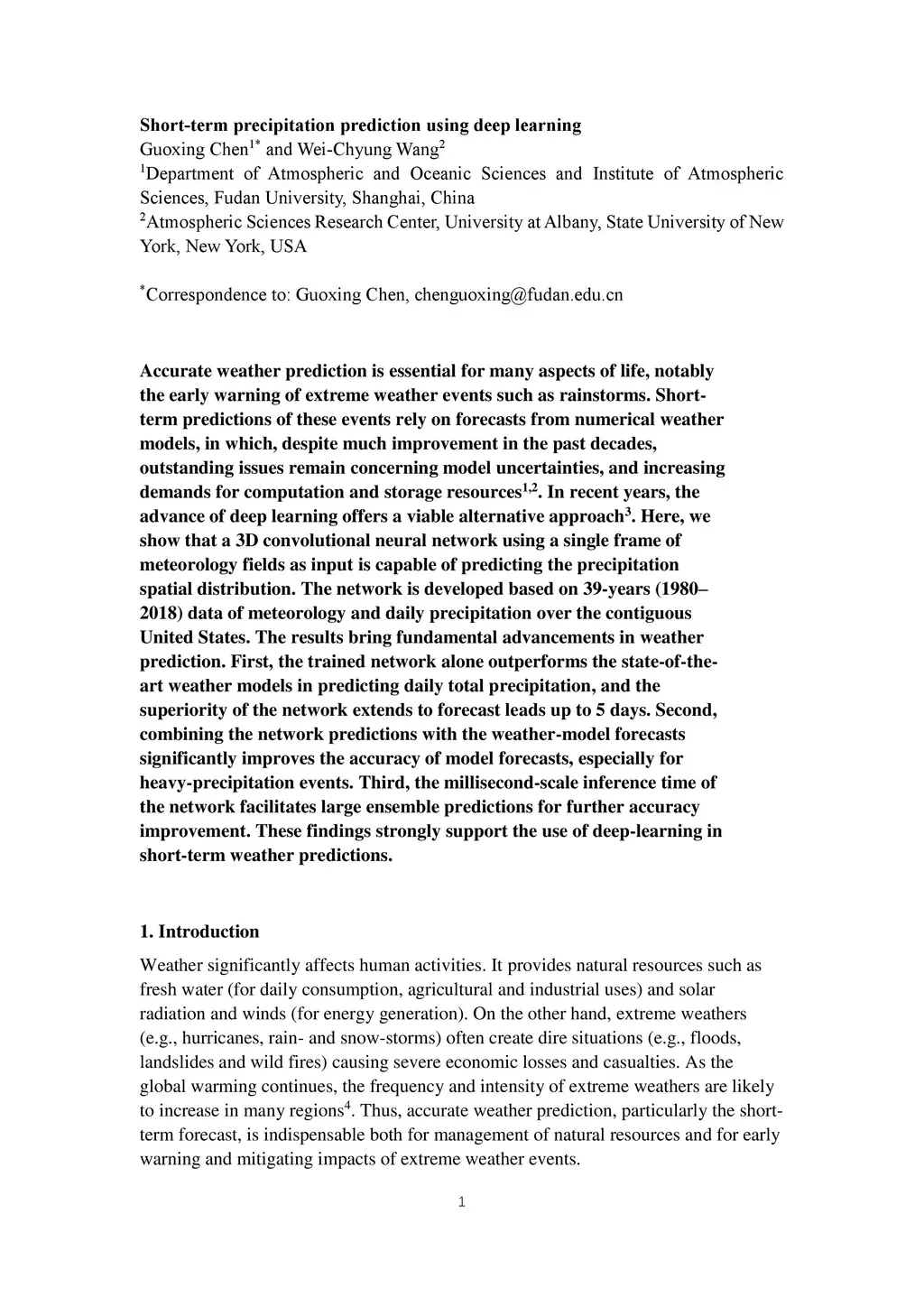 Accurate weather prediction is essential for many aspects of life, notably the early warning of extreme weather events such as rainstorms. Short-term predictions of these events rely on forecasts from numerical weather models, in which, despite much improvement in the past decades, outstanding issues remain concerning model uncertainties, and increasing demands for computation and storage resources. In recent years, the advance of deep learning offers a viable alternative approach. Here, we show that a 3D convolutional neural network using a single frame of meteorology fields as input is capable of predicting the precipitation spatial distribution. The network is developed based on 39-years (1980-2018) data of meteorology and daily precipitation over the contiguous United States. The results bring fundamental advancements in weather prediction. First, the trained network alone outperforms the state-of-the-art weather models in predicting daily total precipitation, and the superiority of the network extends to forecast leads up to 5 days. Second, combining the network predictions with the weather-model forecasts significantly improves the accuracy of model forecasts, especially for heavy-precipitation events. Third, the millisecond-scale inference time of the network facilitates large ensemble predictions for further accuracy improvement. These findings strongly support the use of deep-learning in short-term weather predictions.